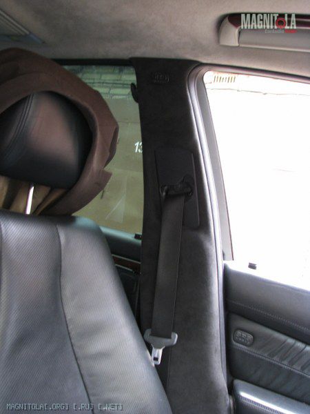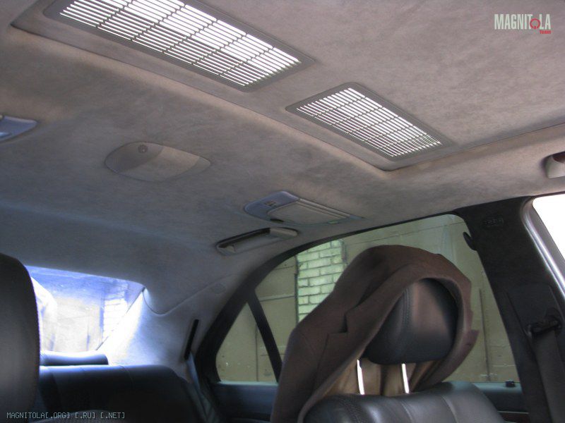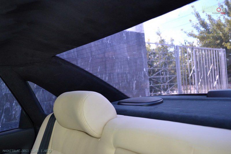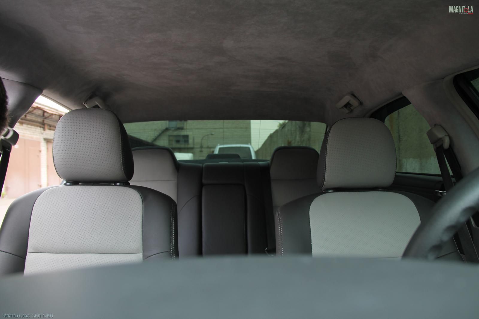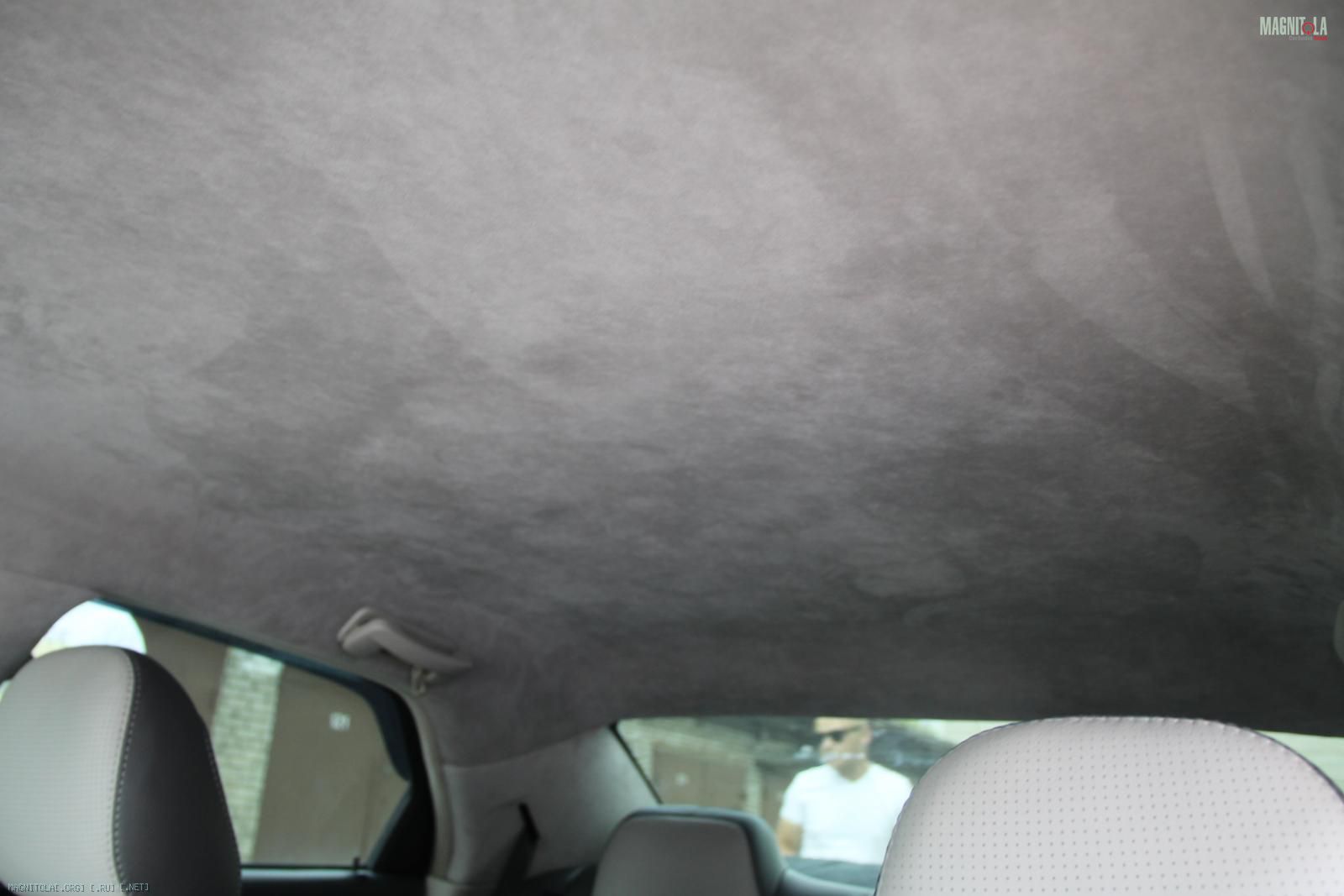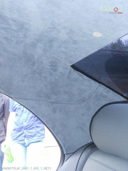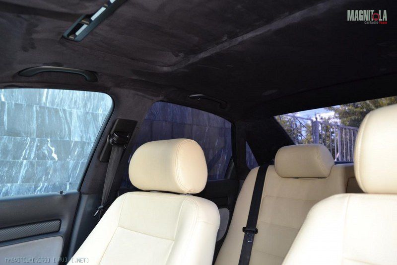 Итак, был перетянут потолок, стойки и козырьки итальянской алькантарой светло-серого цвета. Некоторые версии этого авто производились с именно такими потолками, мы решили тем самым дополнить комплектацию.