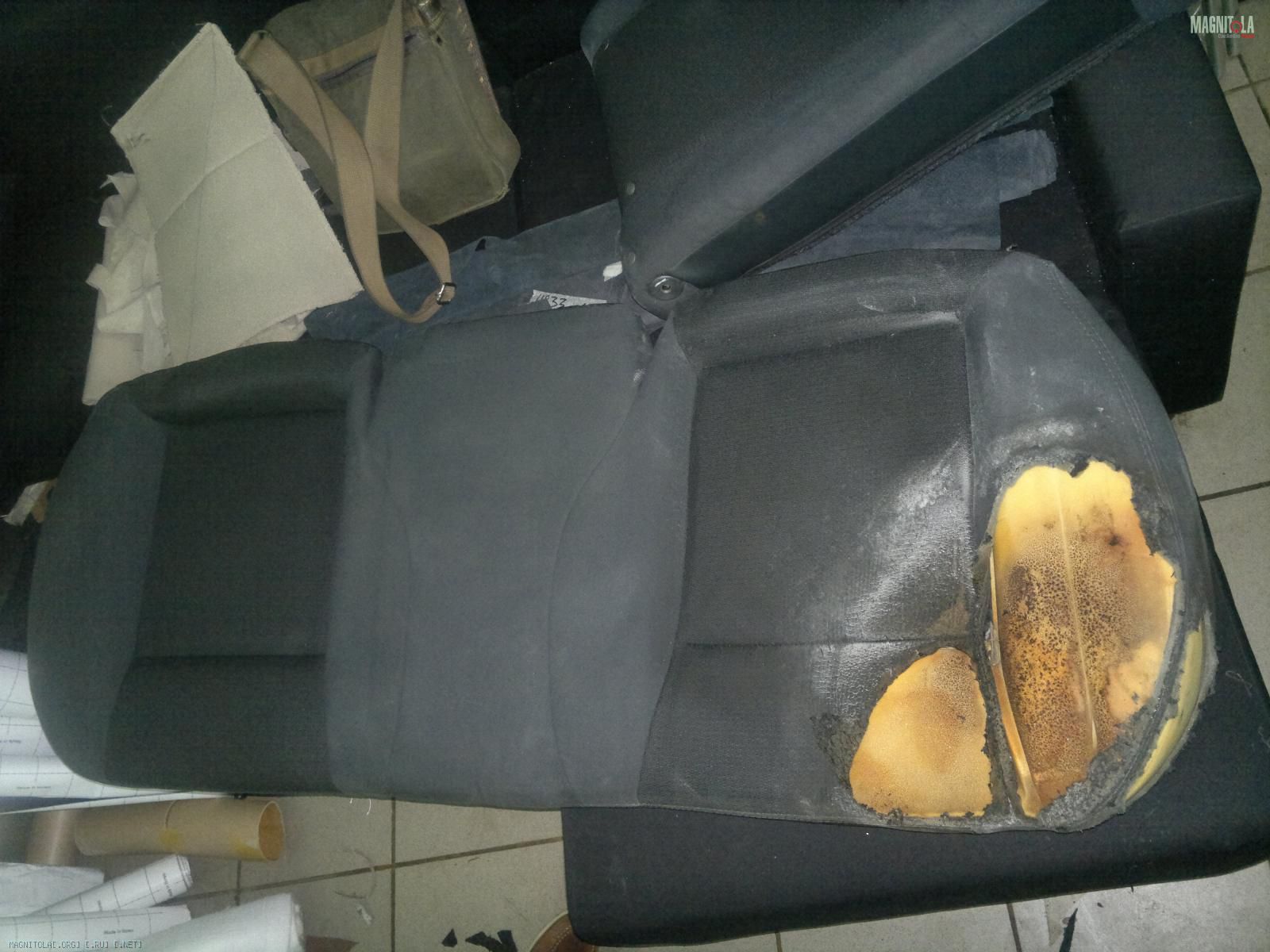 И что же мы увидели, раскрыв дверцы, слабонервных просьба удалиться от чтения этих строк! Первое что было, это запах, жуткий конечно. Потом, откашлявшись и прослезившись, мы начали рассматривать остальные повреждения. А их было не мало, фактически салона не было, задние сидения были оплавлены, на передних стояли какие-то жуткие чехлы, весь пластик закопченный, на ковролине следы от огнетушителя, потолок тоже весь грязный.