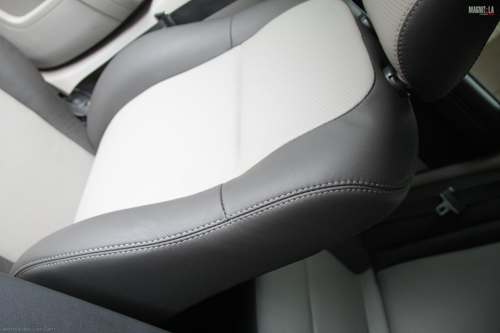 Сиденья же перетянули в кожу темно-серого цвета со светло-серыми перфорированными вставками, и чтобы выделить перфорацию, скажем, создать иллюзию объема, выбрали нитку светло-серого цвета.