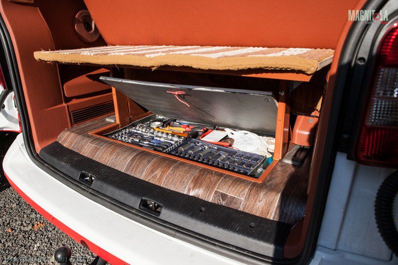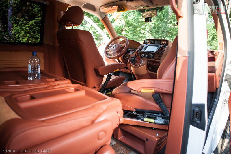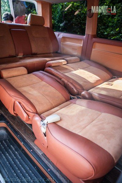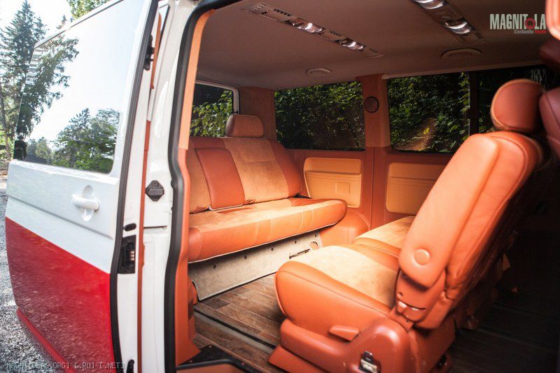 В первую очередь перед сборкой мы проложили хорошую шумоизоляцию и уже после перешли к оформлению салона. Передние сиденья подобрали от X5 – для комфорта лучше не придумаешь: боковые и нижние поддержки, полно регулировок и подкачек. Задние диваны выбрали от японцев (там своего рода микс от разных автобусов японского автопрома). Прикол этих сидений в том, что они трансформеры и могут складываться и разворачиваться при необходимости как угодно. Самым сложным было внедрить эти сиденья в vw, пришлось переделывать крепления под полозья и в итоге все встало как родное.