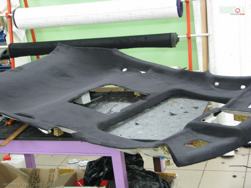 После чистки мы перешли к перетяжке верхней части салона, обтянули потолок, стойки и козырьки в итальянскую альку