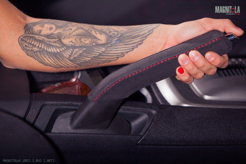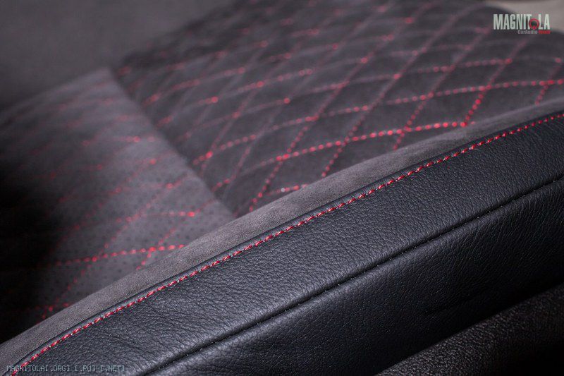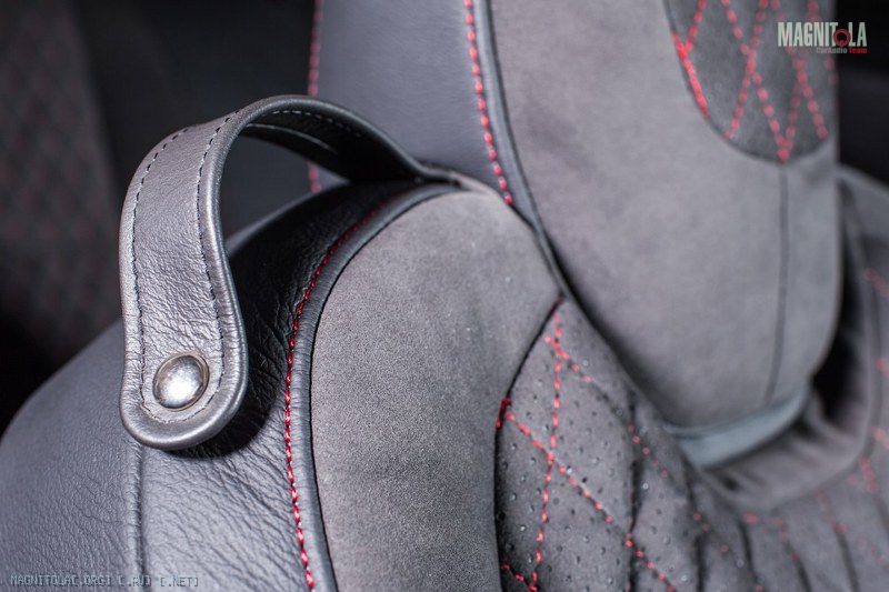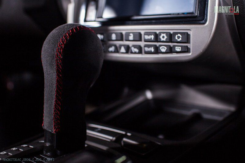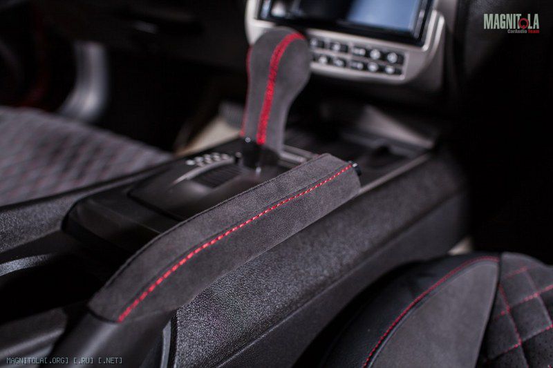Ручку кпп и ручник владелец захотел исполнить в алькантаре с идентичной красной строчкой. Захотел – сделали, нифига не практично, конечно, зато приятно на ощупь! А кто вообще здесь говорит про практичность в таком то авто!