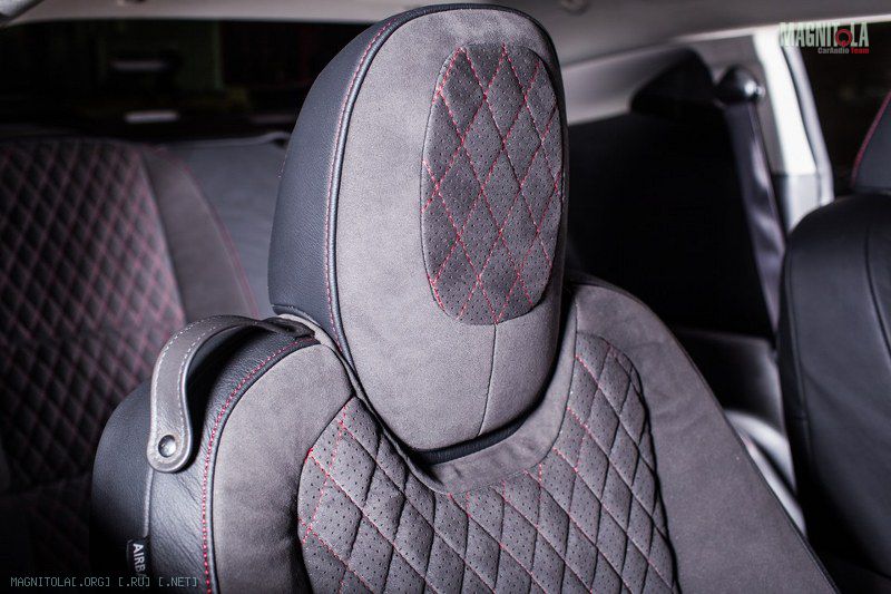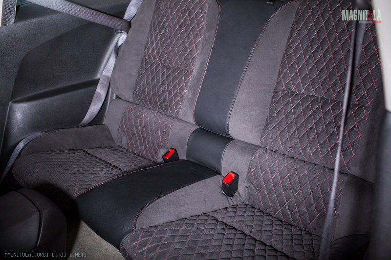 Итак, по желанию хозяина мы перешили сидения в черную фактурную кожу parigi, как раз для брутального авто. По середине сделали вставку из натуральной итальянской перфорированной алькантары цвета антрацит. С виду все кажется, довольно строго, но нет, Борис настоял на ромбиках исполненных красной нитью – это и создало весь антураж. По бокам мы также сделали вставку из алькантары цвета антрацит, но уже обычной фактуры. Подголовники были выдержаны в том же стиле, что и сидения.