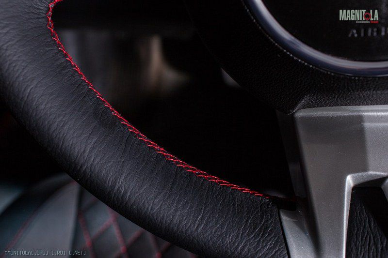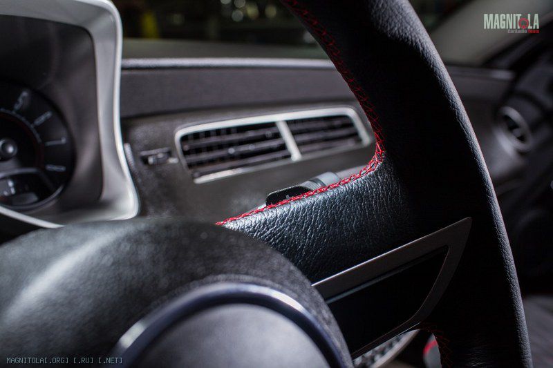 У меня такое ощущение, что шевроле очень экономит на материалах, потому что именно формы салона созданы прекрасно и очень удобны в пользовании. Но что отлично укомплектованные сиденья, что руль, который имеет прекрасную грамотную форму, под классику, обтянуты какими-то довольно странными материалами. Ну скажите мне, как руль может быть резиновый?! Мы исправили и этот косяк, перетянув его в черную кожу и пустив по контуру красную строчку.