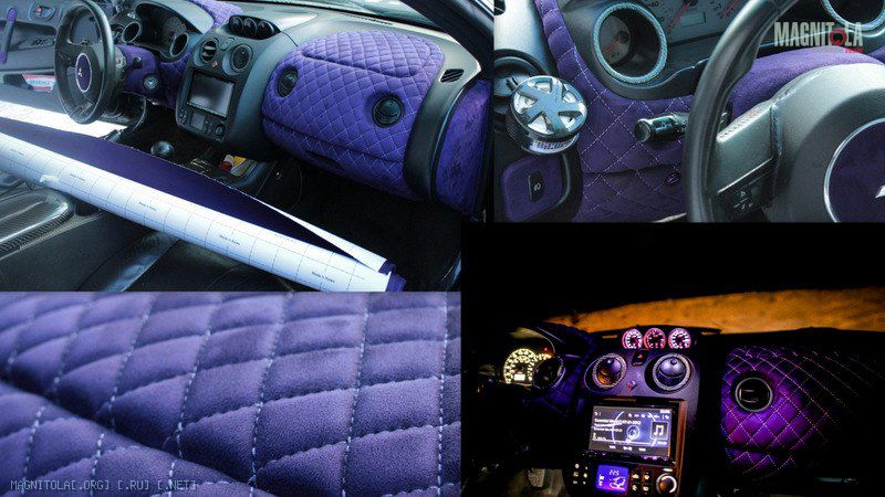 Он приезжал за нашим коронным комплексом – перетяжка всего верха салона. А именно мы перетянули ему потолок, стойки и козырьки в итальянскую алькантару. Также в алькантару мы перешили и ручки, дело в том, что на передних и центральных стойках они прорезинены целиком, а потолочные частично.