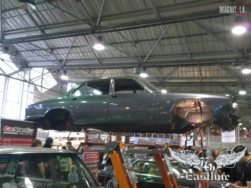 Многие из вас, думаю, были на «oldtimer галерее Ильи Сорокина», которая проходит каждый год, мы там постоянные гости. Мне самому больше интересны янгтаймеры, и я всегда с удовольствием всегда хожу по залам. Больше всего меня цепляют работы московского филиала одной из немецких реставрационных компаний – ребята вплотную занимаются реставрацией кузовов подобных авто. В этом году во втором зале вы могли заметить возвышающийся голый кузов, как раз-таки нашего Ягуара, над салоном которого нам выпала честь трудиться. Они его специально подвесили для того, чтобы посетители могли посмотреть частично проделанную работу над днищем: они очищают его сухим льдом (криогенная очистка), и гарантии на свои работы дают до 50 лет без проблем.