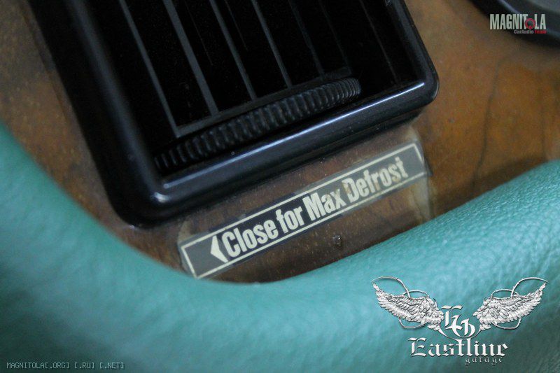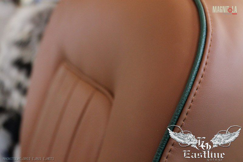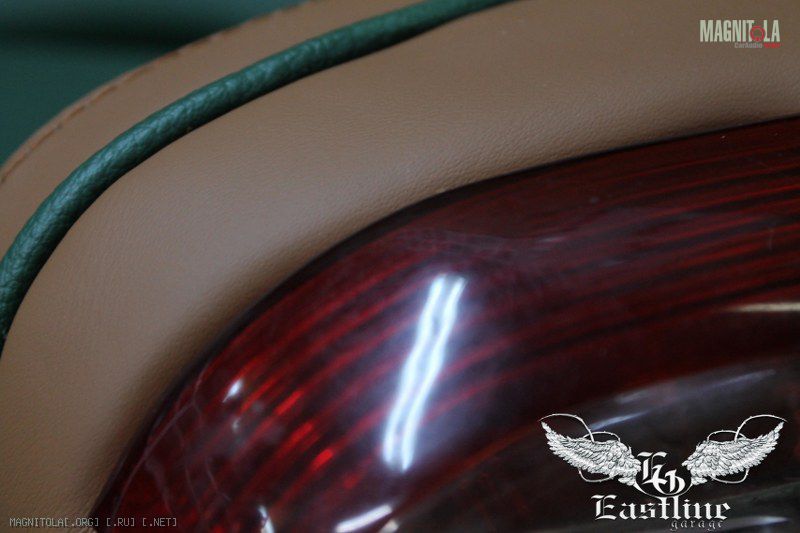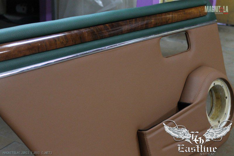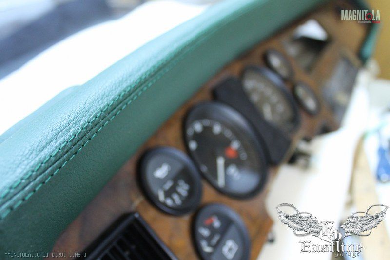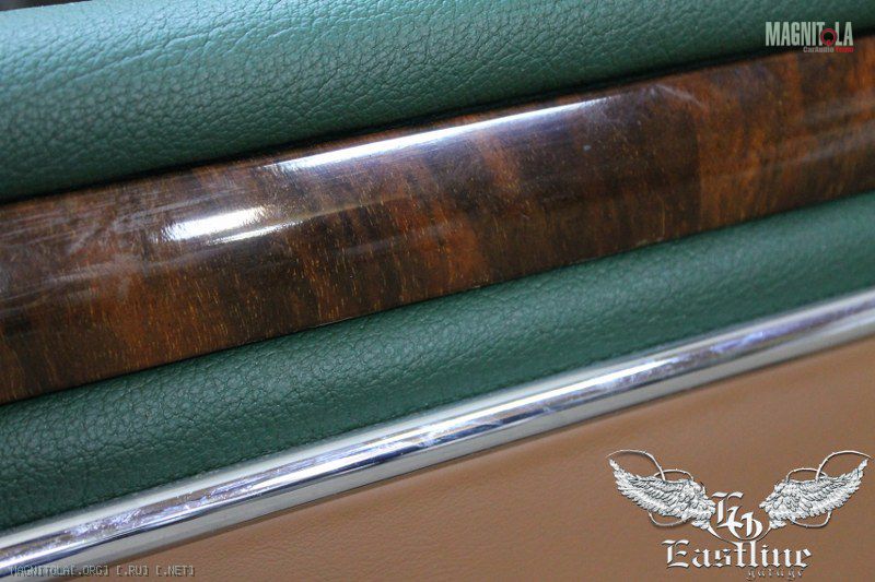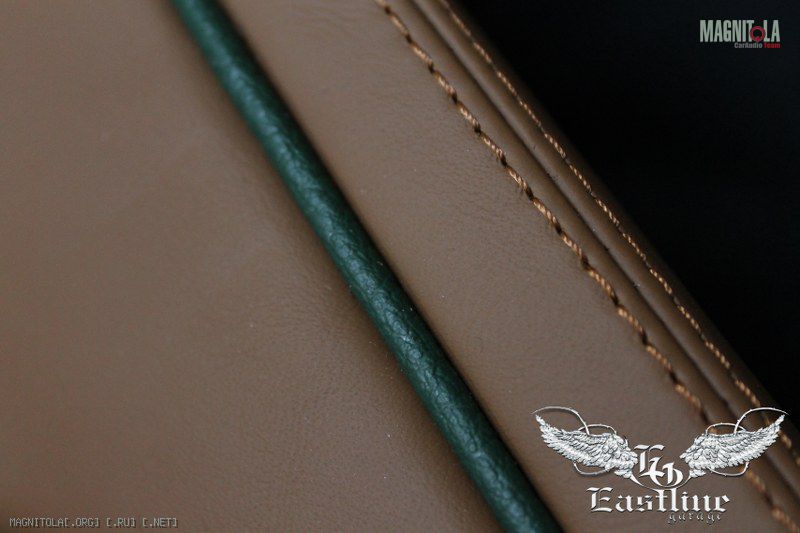 Дверные карты целиком были обтянуты в рыжую кожу, а верхняя часть - в зеленую. Подиумы под колонки были доработаны; в дверных ручках был вставлен зеленый кант. Приборная панель, она, кстати, целиком монолитная из дерева – смотрится достойно!