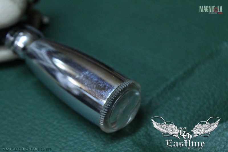 Далее следовал рычаг КПП, для него мы заново пошили юбку, перетянули в перфорированную кожу и, выдерживая все в одном стиле, пустили белую строчку.