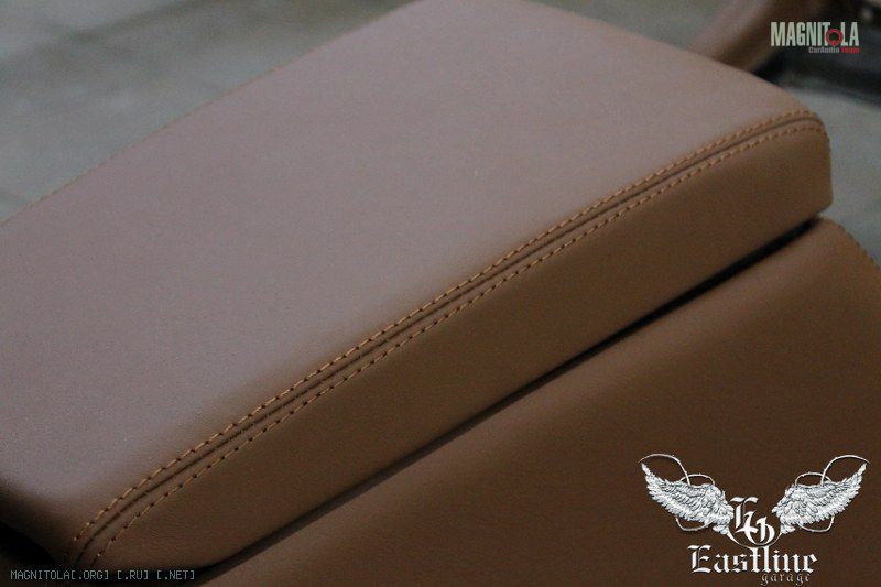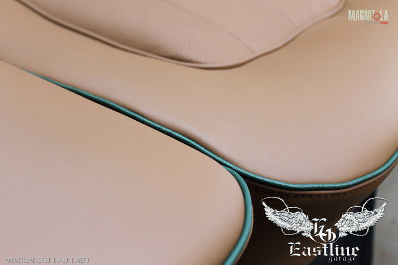 За основу была взята рыжая кожа «bentley» - очень «богатый» цвет. Центральная часть перфорированная, но перфорация здесь неспроста, т.к. была произведена ещё одна дополнительная инсталляция в виде вентиляции (обдува), а т.к. авто планируется на каждый день в летний период времени здесь это будет не лишним. Завершающим штрихом по сиденьям стал зеленый кант, пущенный по краям - это стало изюминкой.