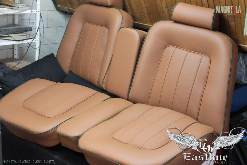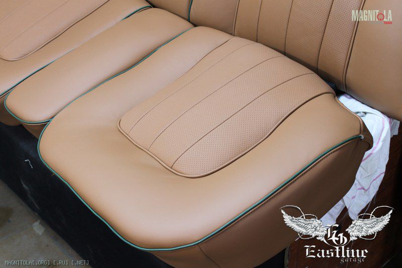 Далее заменили старый поролон на новый, заднюю часть пришлось переформовывать, опять же, под ниши для столиков. В автомобилях тех лет сиденья сами по себе были громоздкие и крой центральной части очень интересный (в форме подковы), посему на такие ретро авто, как правило, уходит намного больше кожи.