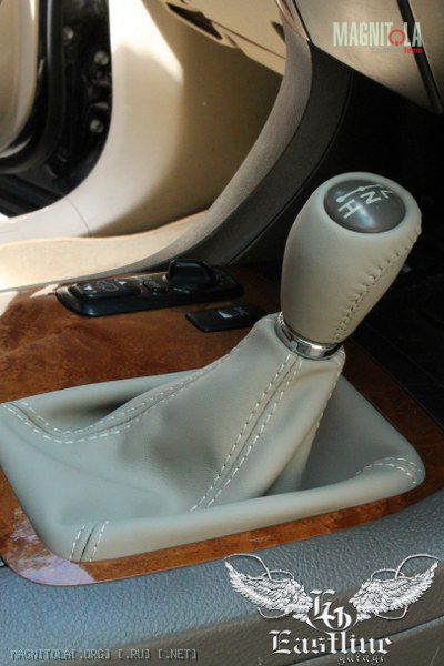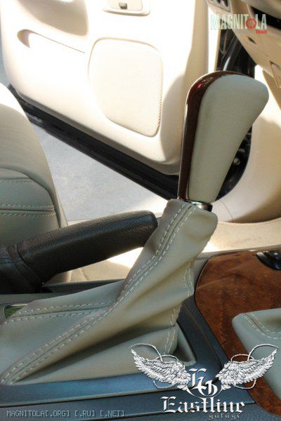 После обновили руль и ручку кпп, раздатки и чехольчики к ним. Перешивали в те же цвета, в кожу Nappa с простой белой строчкой. К слову сказать, салон авто очень просторный, но с таким цветом внутренней отделки он кажется ещё больше, светлее, уютнее.