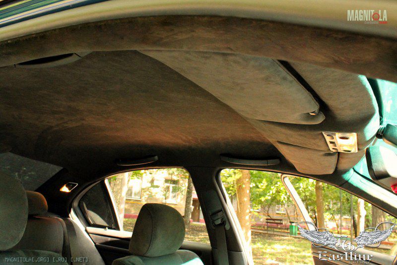 Так мы с радостью и неким трепетом принялись за работу. Перетянули потолок в итальянскую алькантару цвета антрацит. В случае с BMW другие цветовые решения подбирать как то и не приходится.