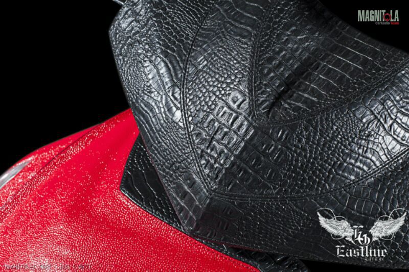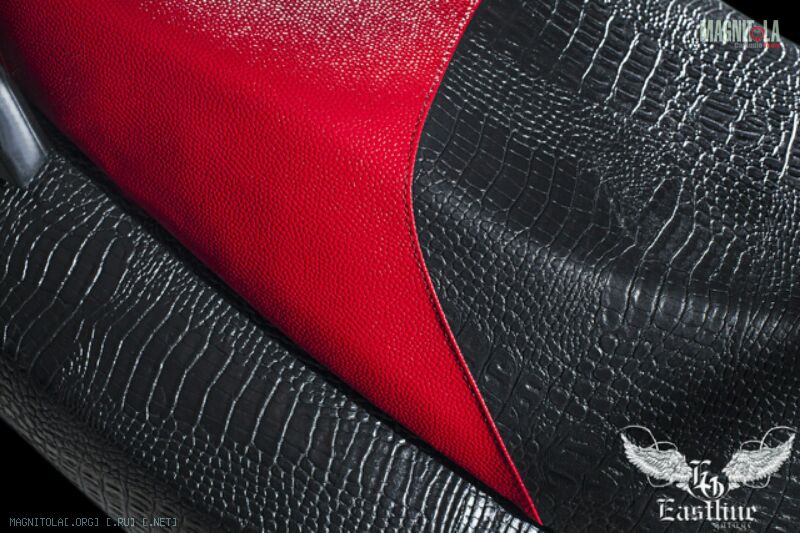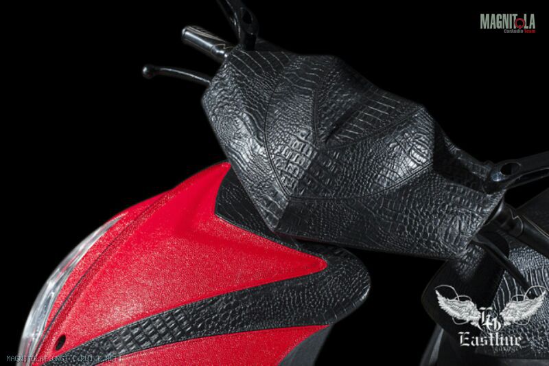 Мы решили сделать скутер максимально аутентичным и «рептилоидным», для чего мы выбрали специальную мотокожу. Да, именно так – весь пластик на скутере мы решили перешить, используя искуственную мотокожу с текстурой «под рептилию». Для этого наши специалисты разработали проект с комбинированием сразу двух видов искуственной кожи: чёрная, «крокодиловая», могущая похвастаться заметным крупным узором, и «питонья» кожа с более мелким узором, дерзкого кроваво-красного цвета. Конечно же, всё это мы добро – с максимально качественной обстрочкой, чтобы ни один шов не разошёлся.