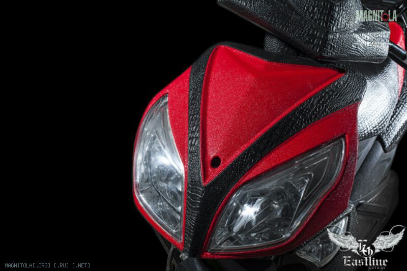 Мы сразу же отмели в сторону все заезженные варианты, как однотонная матовая/глянцевая плёнки – выделиться бы такой скутер по-настоящему всё равно не смог, а нам хотелось сделать что-нибудь примечательное. Плёнка «под хром» после недолгого обсуждения также была исключёна – всё это уже неоднократно видели, уникальности в этом не было ни на грош. Вариант с виниловой кожей «под рептилию» заинтересовал нас несколько больше, но и здесь нам не хватило размаха – винил, всё равно остаётся винилом. А мы хотели зайти ещё дальше.