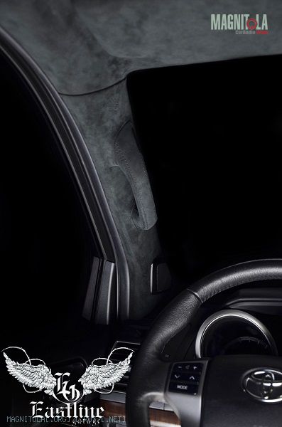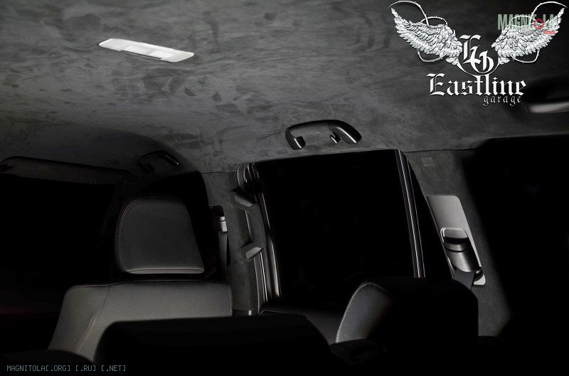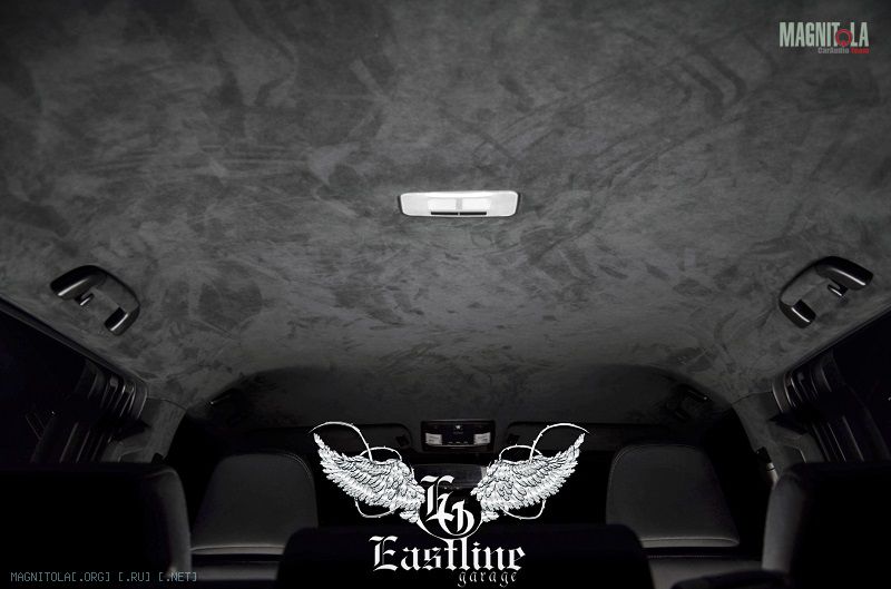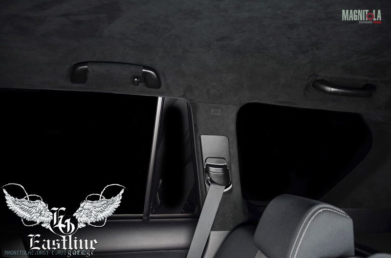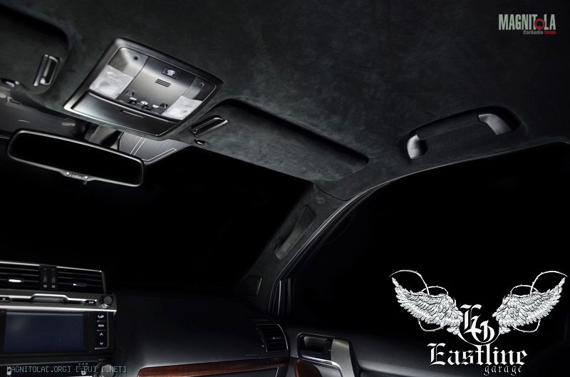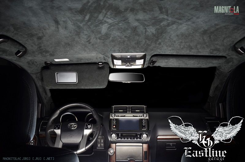 Вернемся к нашему Land Cruiser Prado. Потолок было решено перетягивать именно итальянской алькой, цвет выбранного материала – черный. В авто таких размеров черный цвет ни сколечко не скрадывает пространство, а наоборот, привносит больший уют.