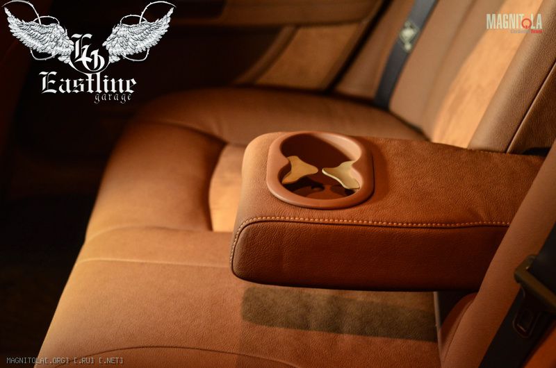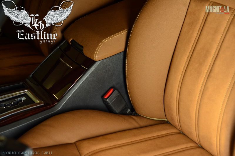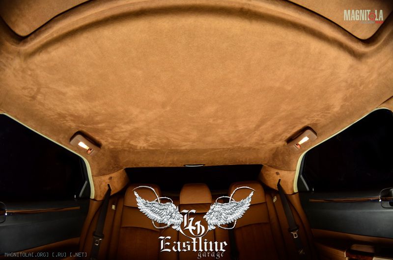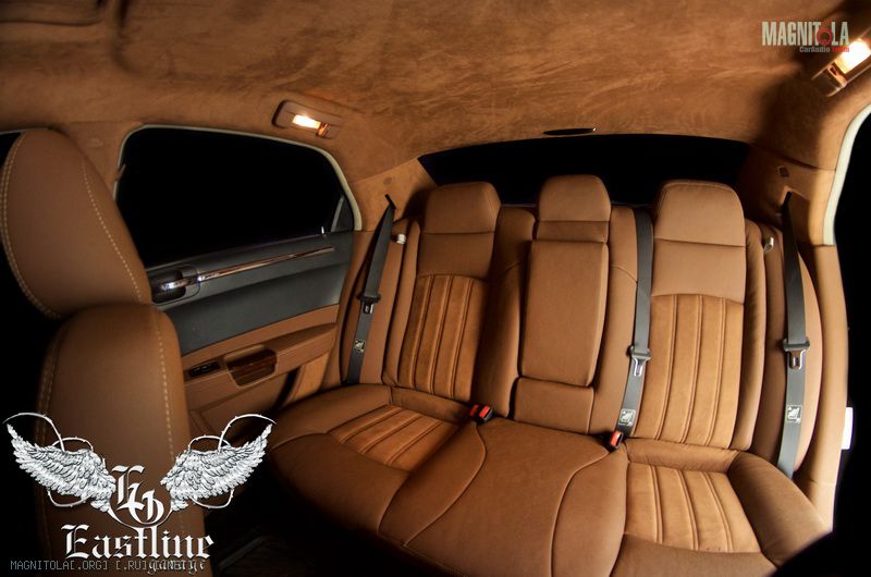 Далее поговорим о таких составляющий автомобильного салона, как двери, пороги и боковые стойки. Большую часть дверей, все пороги и боковые стойки мы переодели в экокожу, по своей структуре максимально приближенной к натуральной коже . Если Вы помните, то верхняя часть стоек, как и весь потолок в алькантаре, а в коже у нас отныне лишь их нижняя часть. Экокожа коньячного цвета с фактурным тиснением выглядит очень дорого и презентабельно. Так как данный вид кожи предназначен специально для перетяжки автомобильных салонов, он рассчитан на долгую и частую эксплуатацию. Благодаря этим показателям, экокожу можно использовать даже для таких мест, как пороги. Уход за экокожей достаточно прост: протер тряпочкой или мыльным раствором и все, экокожа вновь выглядит как новая. А при очень сильных загрязнениях обычная химчистка поможет вернуть ей былую красоту. Но, так как мы любители совершенства, а оно, как известно, проявляется в мелочах, без некого акцента мы не могли обойтись. В салоне этого Chrysler 300C таким акцентом стала декоративная строчка сливочного цвета, которая проходит по внешнему краю боковых стоек и порогов, а также на дверях: горизонтально от одного края к другому, через ручки.