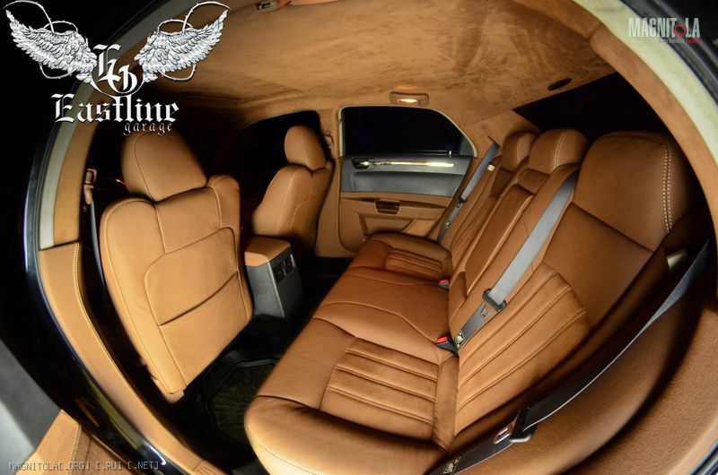 Chrysler 300C – комплексная перетяжка салона автомобиля итальянской алькантарой и экокожей коньячного цвета. Перетяжка руля. Аквапринт пластика.