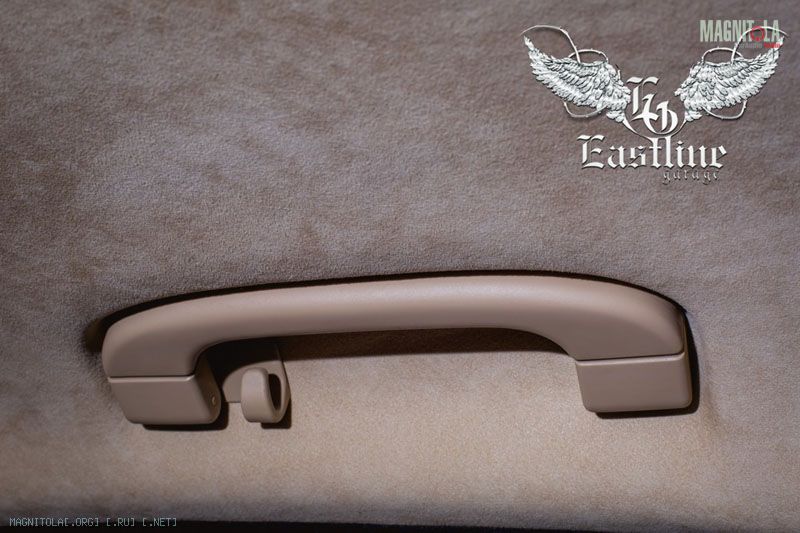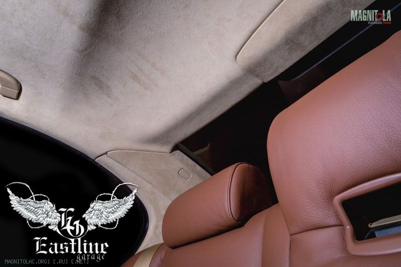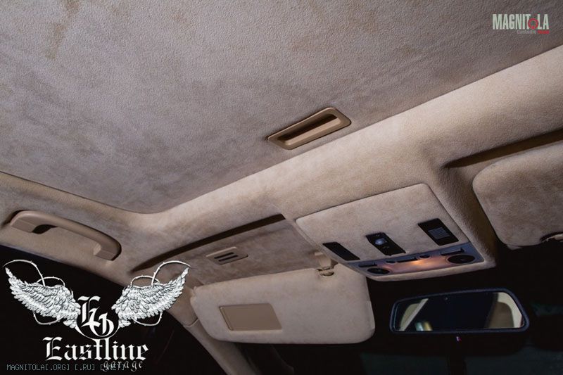 Цвет итальянской алькантары мы подобрали в тон бежевым вставкам на перечисленных выше элементах салона. Потолочная панель, шторка люка, стойки и козырьки от солнца отныне «переодеты» в итальянскую алькантару.