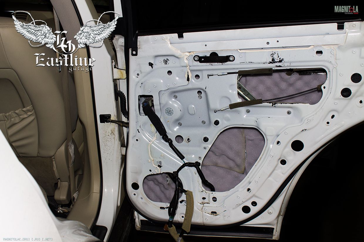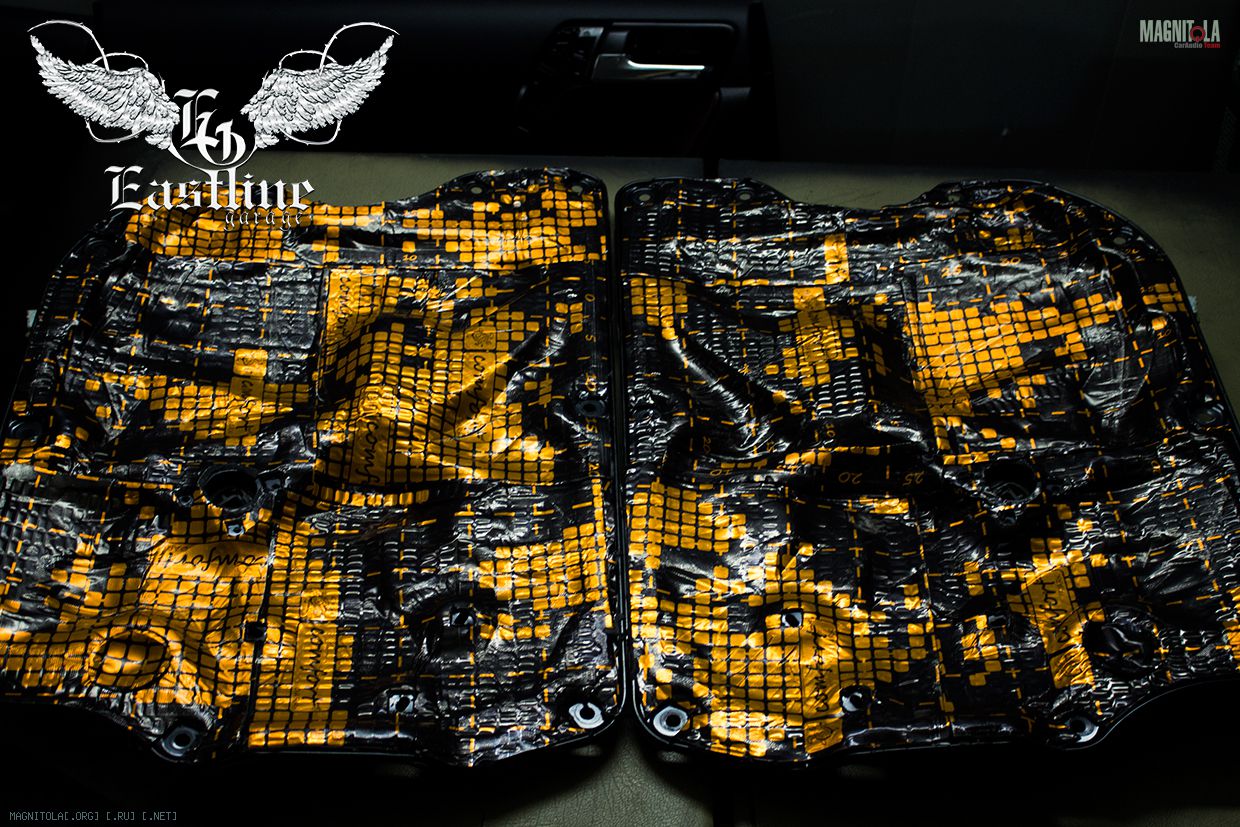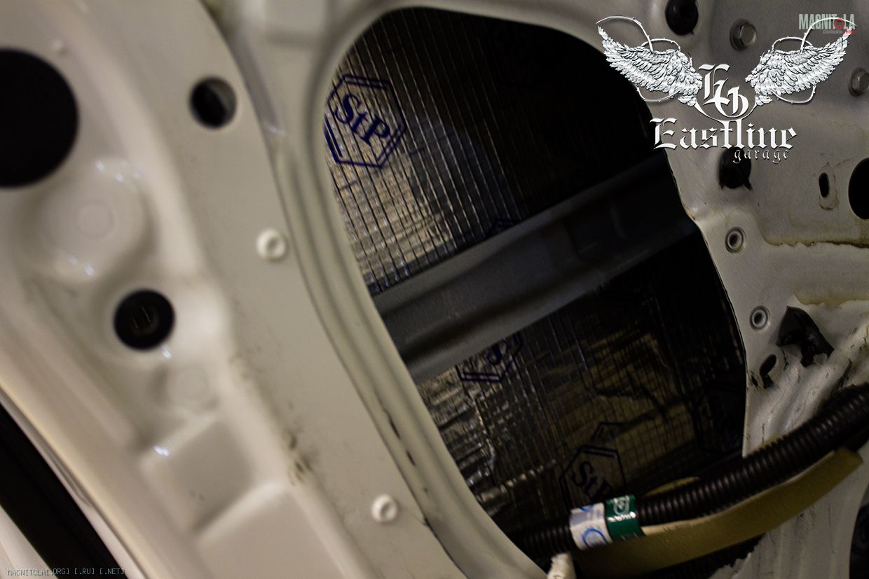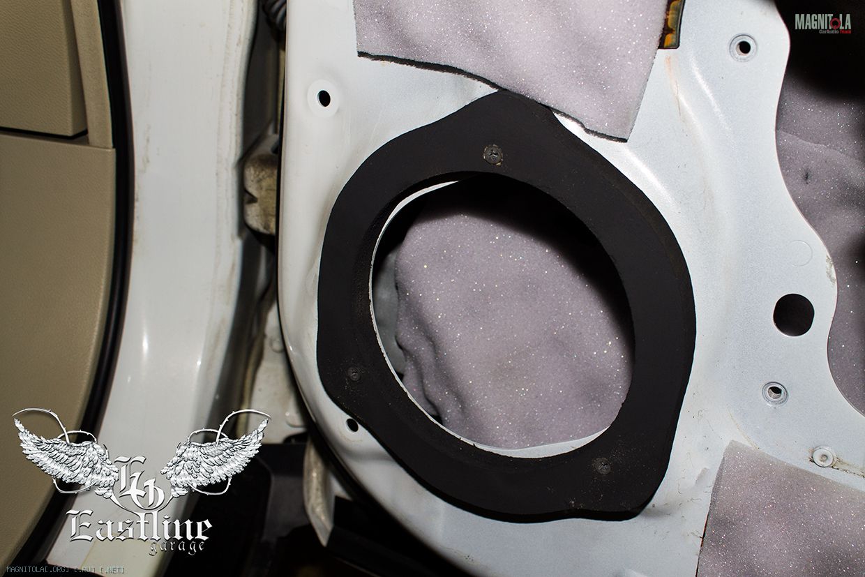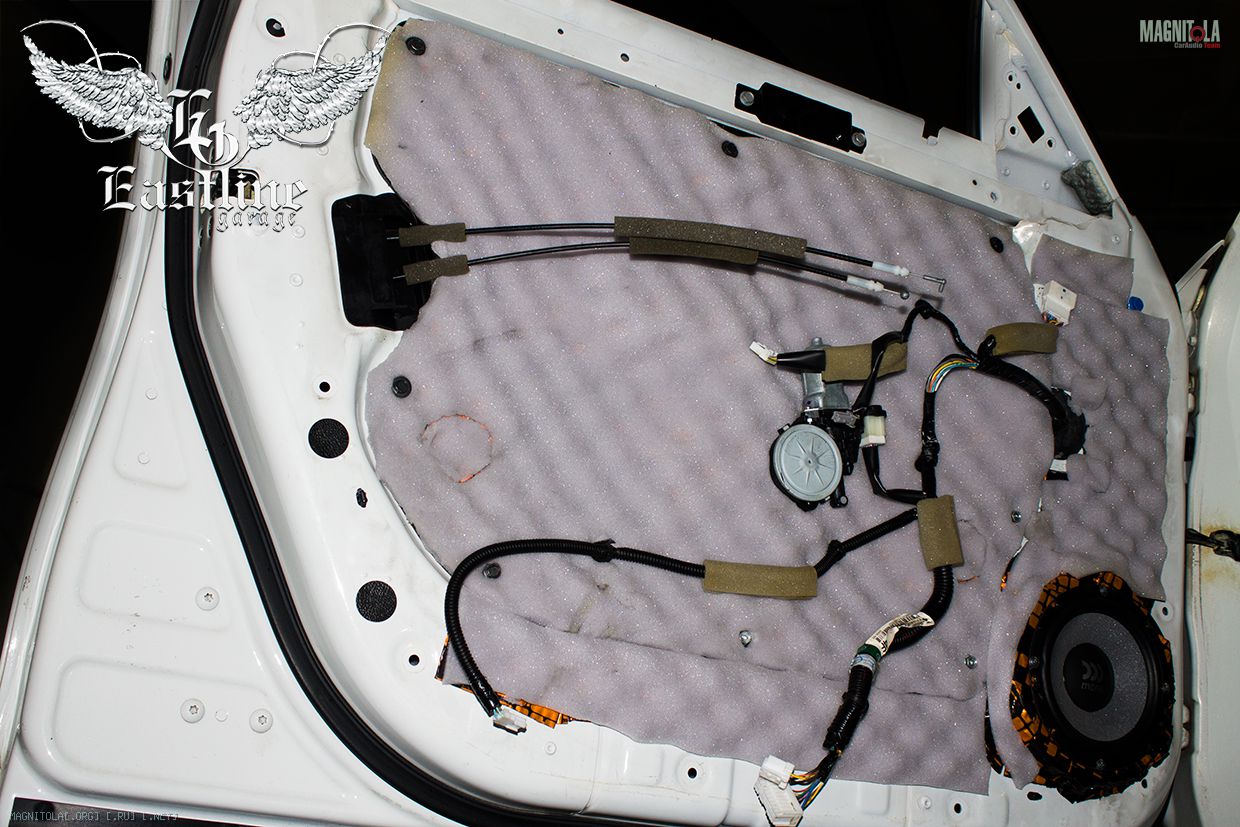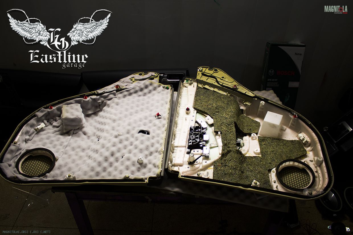 Так как обновленная акустика мощнее штатной, то части автомобиля, где она была установлена, должна быть усилена. Двери были дополнительно проложены шумо и виброизоляцией и обработаны антискрипом. В качестве вибродемпфирующего материла мы использовали серию Comfort Mat линии Dark, так именно он прекрасно подходит для мест с сильной вибронагруженностью. Звкукопоглотитель, который кладется поверх материала Comfort Mat Dark — Violon Wave. Пористая структура и волнообразная поверхность не оставят в салоне авто лишних шумов. А антискрип, которым проложены двери авто избавит уши владельца от скрипов и сверчков, исходящих от дверей и дверных карт.