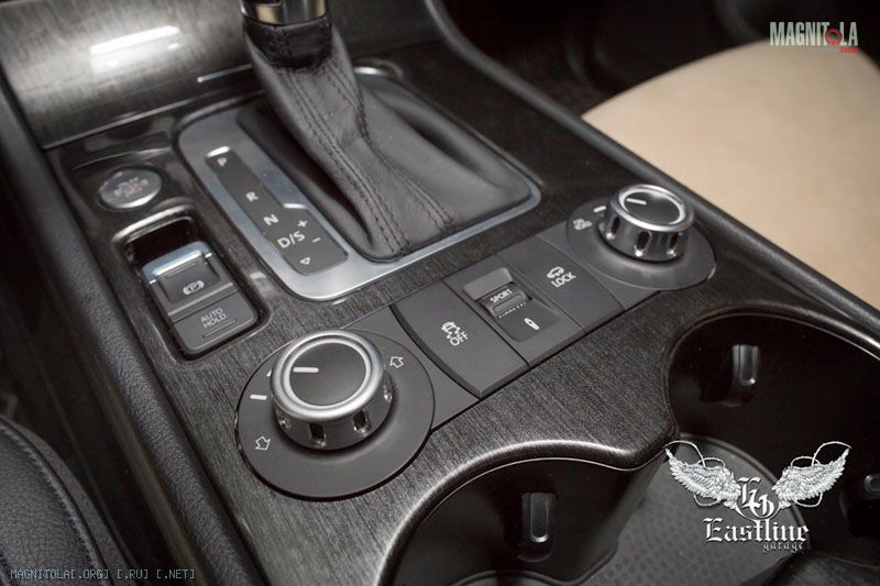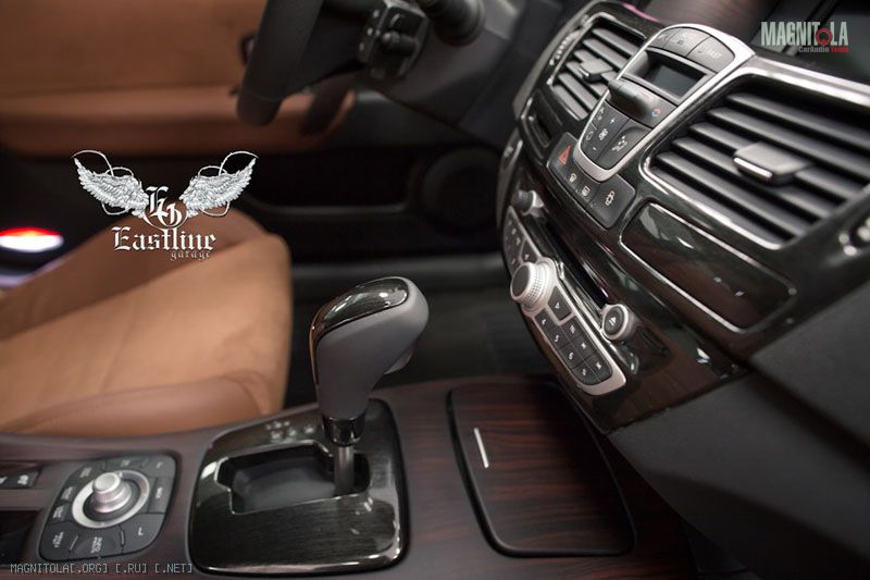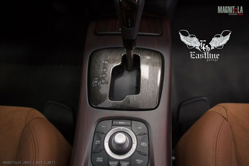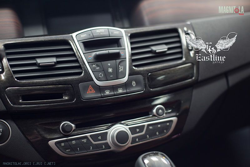 Для придания более богатого и стильного вида текстура покрыта матовым лаком . А вот на накладки магнитолы и ручки селектора КПП нанесена глянцевая текстура темного шлифованного алюминия. Такое решение принято с целью внесения ноты цветового и фактурного акцента и придания большей спортивности салону. Глянцевой текстура становится благодаря нанесению лака, при выполнении такой работы наши мастера наносят минимум 3 слоя лака, для придания глубины цвету и более выраженного блеска элементов.