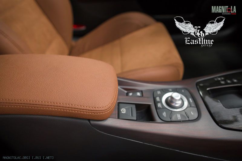 Такое решение позволило создать эффект полного погружения, интерьер построен таким образом, что создается впечатление единого пространства, выполненного в экокоже и алькантаре. Отдельного внимания удостоился и подлокотник закрывающий нишу на центральном тоннеле, он также полностью обтянут экокожей коньячного оттенка с декоративной прострочкой.