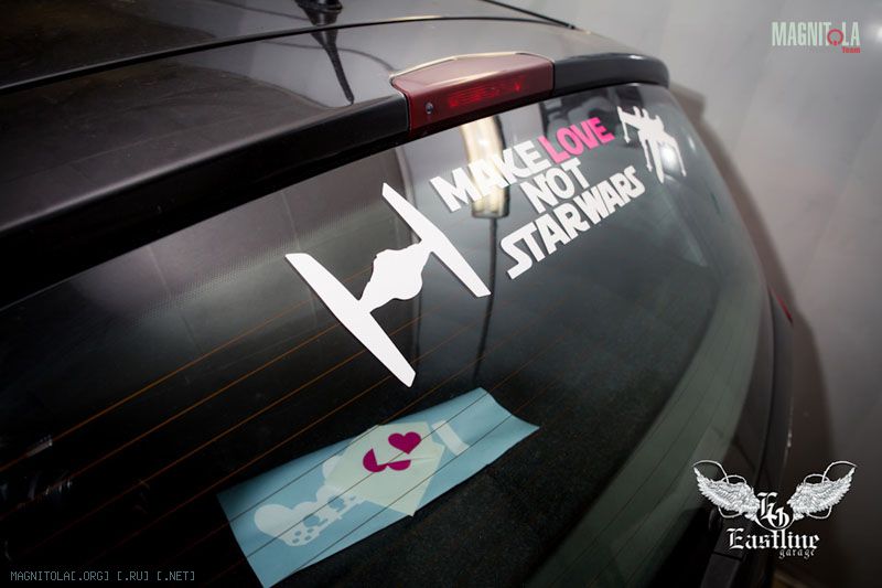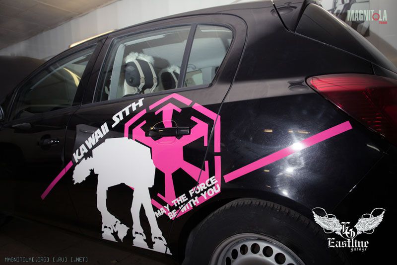 Изменений много, но из самых масштабных отметим винил, его невозможно не заметить, по бортам машины появились бело розовые изображения символов тематики Звездных войн и различные звездолеты и прочая фантастическая техника. Лобовое и задние стекла отныне могут похвастаться надписями «sith starfighter» и «make love not star wars» и что самое главное шрифт выбран стилизованный под оригинальный, разработанный специально для киносаги.