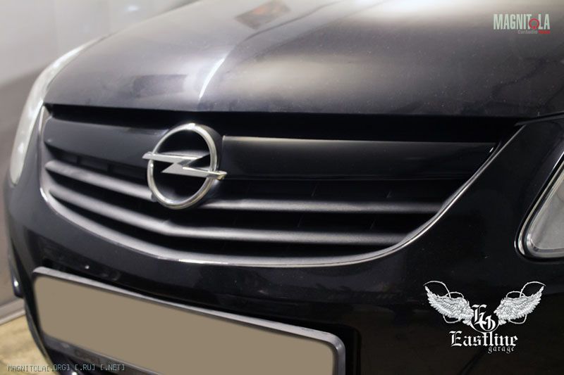 Еще один штрих во внешнем облике это глянцевая черная пленка на решетке радиатора, для черной Корсы это отличный шаг к созданию собственного облика. Антихром решетки радиатора не сложная операция, но позволяет в короткие сроки изменить восприятие автомобиля и выделиться в общей массе.