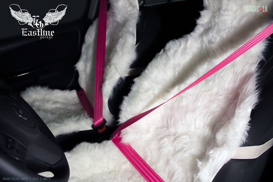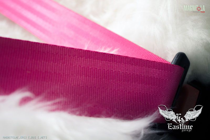 В салоне этого авто розовые ремни продолжают тему, заданную внешним винилом, даи потом, какая женщина не любит розовый.