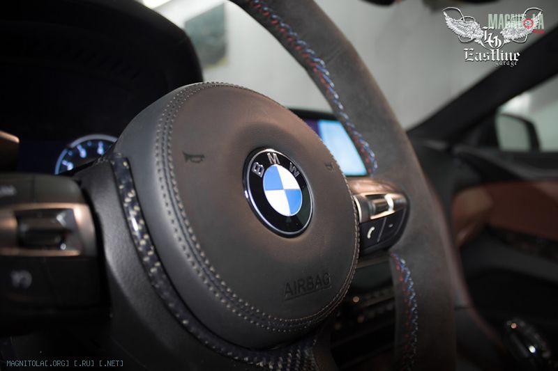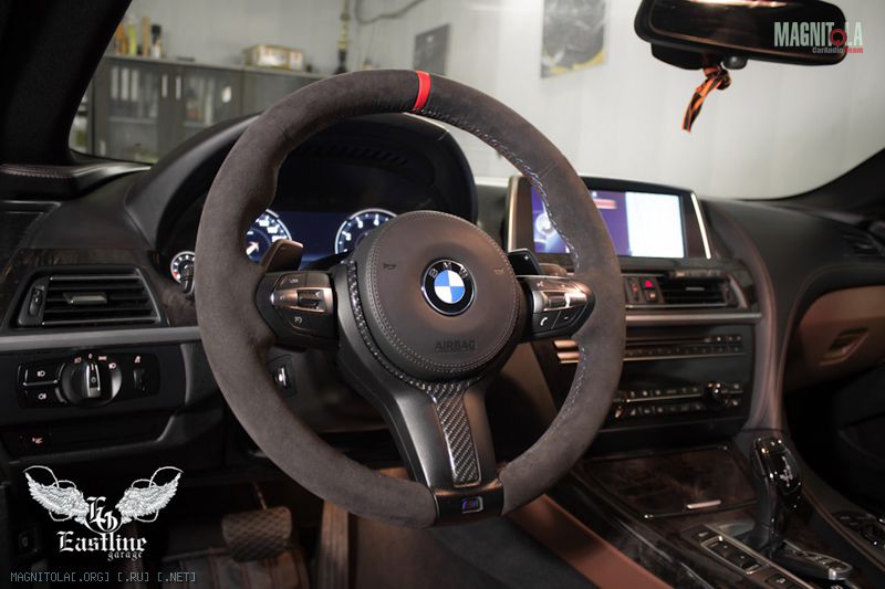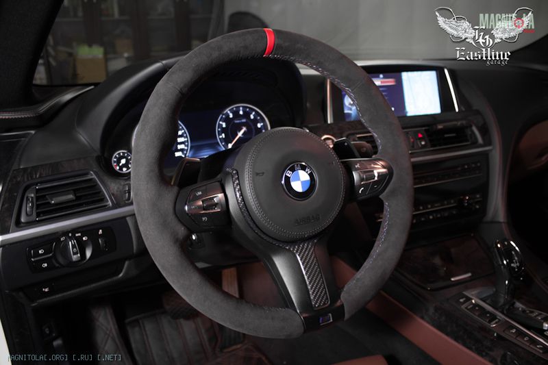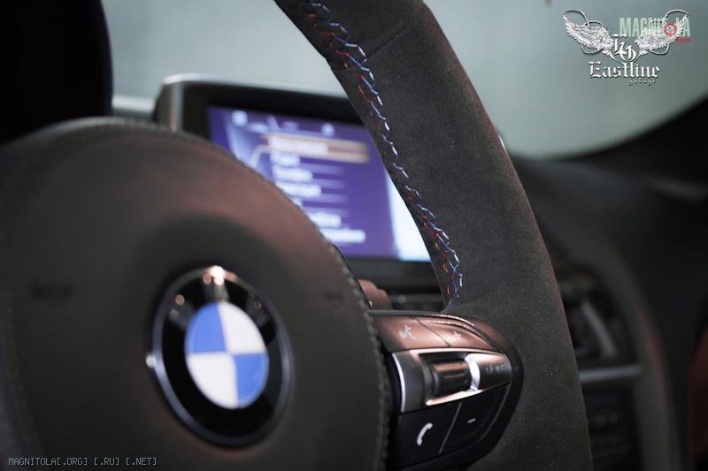 BMW 650i (F13) — перетяжка руля алькантарой с дополнительной нулевой отметкой и перетяжка подушки руля в натуральную кожу.