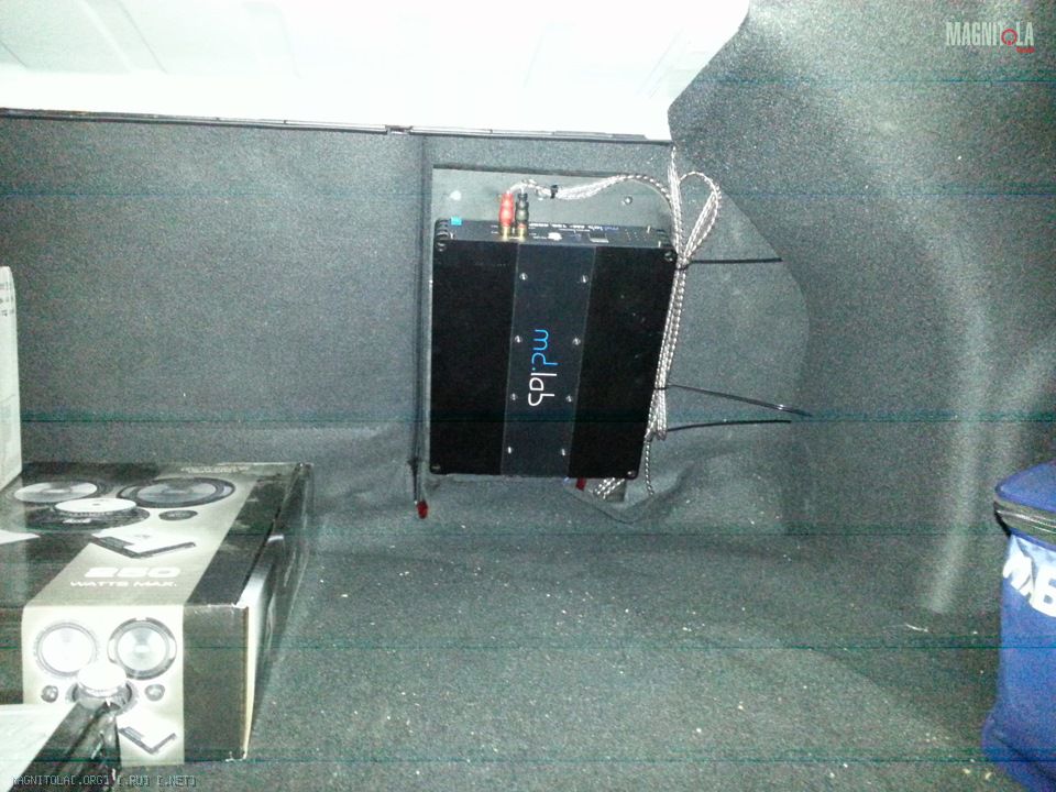 да, усилок стоит на спинке сиденья через деревянную проставку, то есть контакта корпуса с кузовом нет.