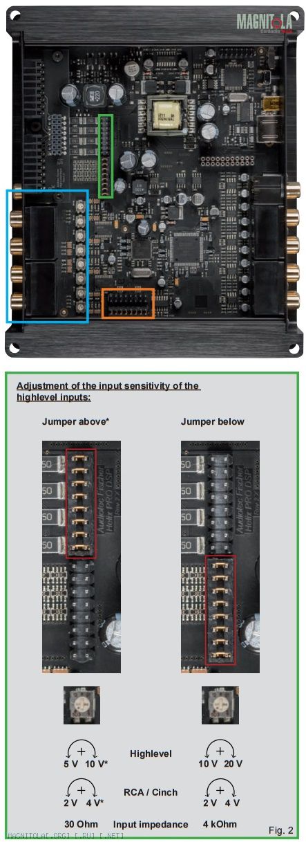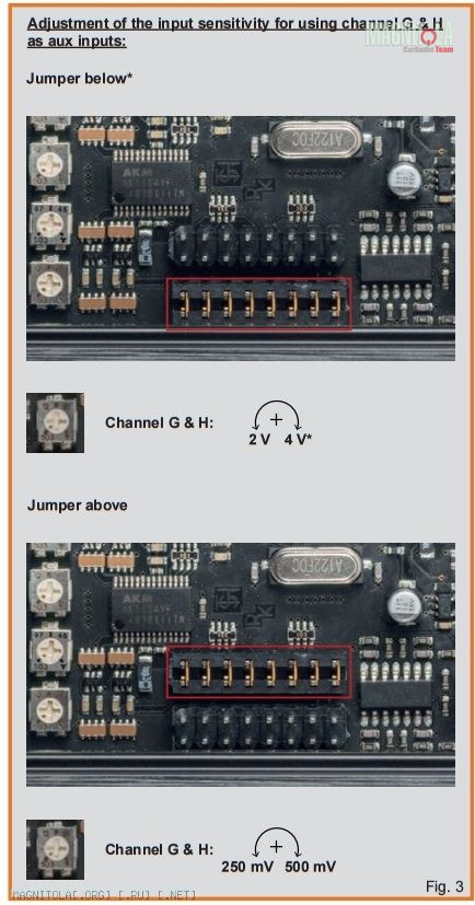 Если вам не хватает диапазона регулировки чувствительности (при использовании входов высокого уровня), то необходимо изменить диапазон путем перестановки перемычки. Обратите внимание, что "перемычка" работает только с входами ВУ.