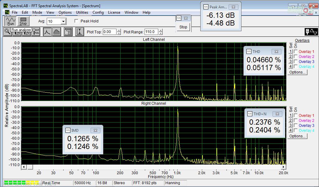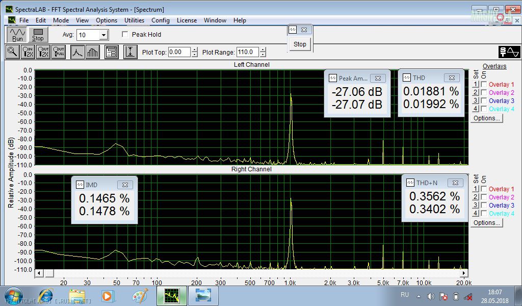 Под конец посвящение твикерам, которые любят (в лучшем смысле этого слова) вырезать фильтры и менять операционники. Так выглядит гирлянда самых дешманских ОУ, THD – 0,004%. Просто сравните с тем, что вытворяет выходной каскад УМ, на верхних картинках.