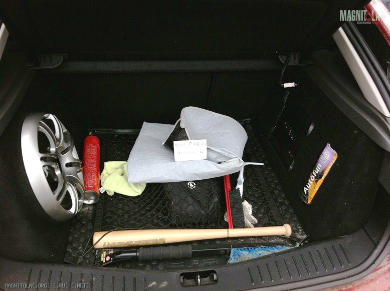 Пенопласт с багажнике подрезан так, чтобы увеличить объем но оставить место для полноразмерной запаски + прилажена светодиодная подсветка в "шторку" багажника