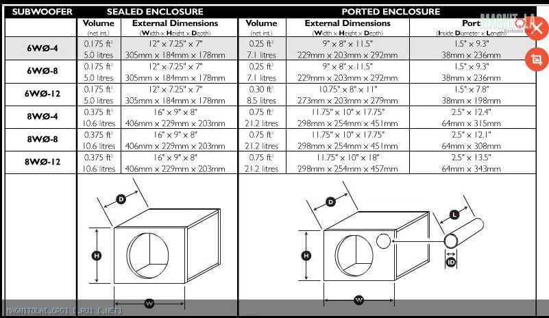 Рекомендуемые системные требования корпуса Минимальная Sealed Box Объем: 0,375 кубических футов (10,6 литров) или 16 "х 9" х 8 "(406 мм х 229 мм х 203 мм) Максимальная Sealed Box Том 0375 кубических футов Минимальная Портированные Box Объем: 0,75 кубических футов (21,2 литров) или 11,75 "х 10" х 17,75 "Максимальная Портированные Box Том 0,75 кубических футов Топ-Mount Глубина 4,063 "