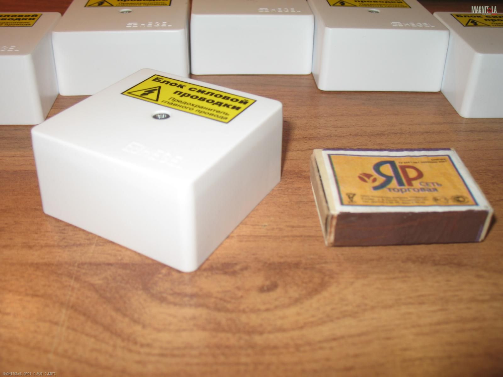 Устройство выполнено в электротехническом брызго-защищенном корпусе размерами 60х60х30 мм. Крышка одеваеться сверху и фиксируеться небольшим шурупом сверху. Все довольно просто и надежно. Важной особенностью являеться - мягкий пластик всех деталей корпуса - при любых минусовых температурах - он не трескаеться, не колеться, а - пружинит, как бы тянется. Поэтому повредить, уронив, устройство практически нельзя. Сравниельные фото рядом со спичечным коробком: