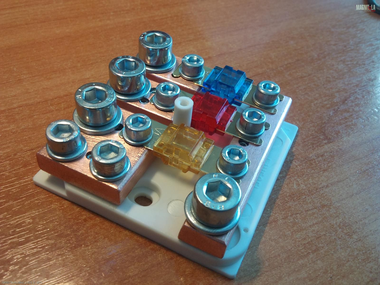 По заказу одного из клиентов был разработан интересный вариант плюсового распределителя, в котором один из выходных терминалов имеет увеличенную площадь. Площадь эта с умом использована - под размещение еще 2 крепежных болтов меньшей мощности. К стандартному М8 добавлены 2х М6. Данный распределитель удобно использовать когда необходимо помимо 2-3 усилителей запитать например еще процессор, реле ремоут или просто кулеры охлаждения. Посадочные места М6 как раз подходят для стандартных вилочек или наконечников 6-16 мм2.