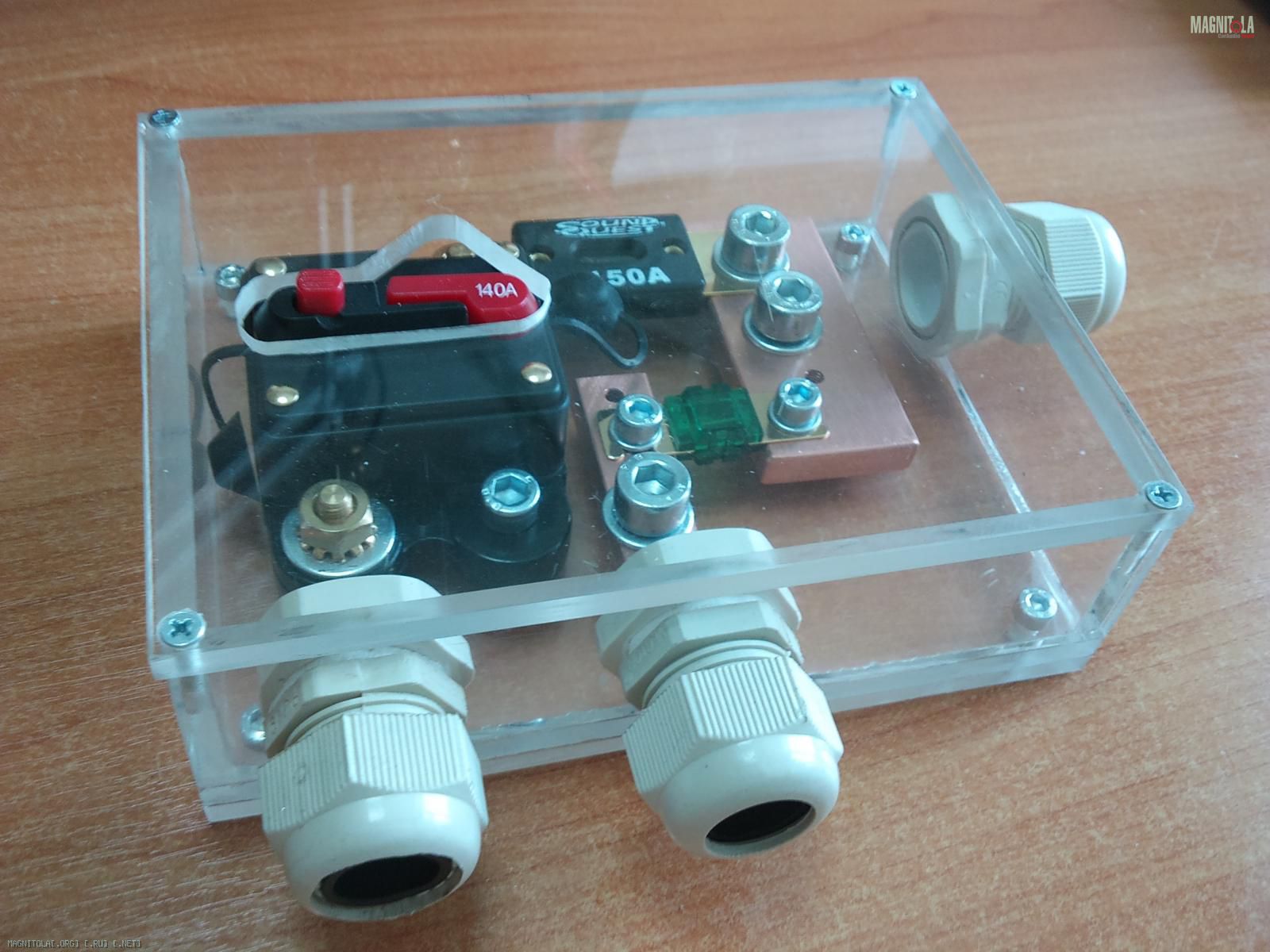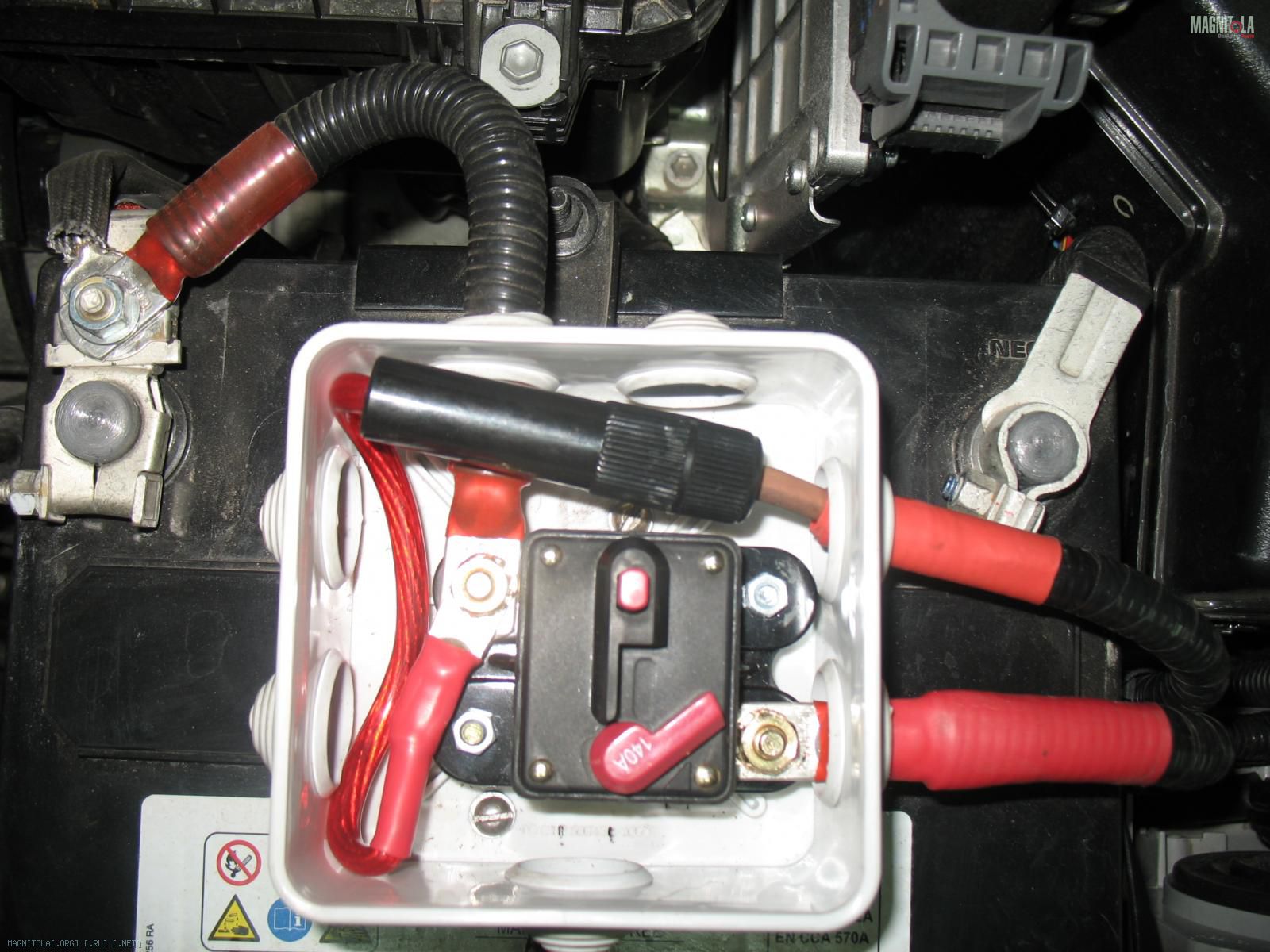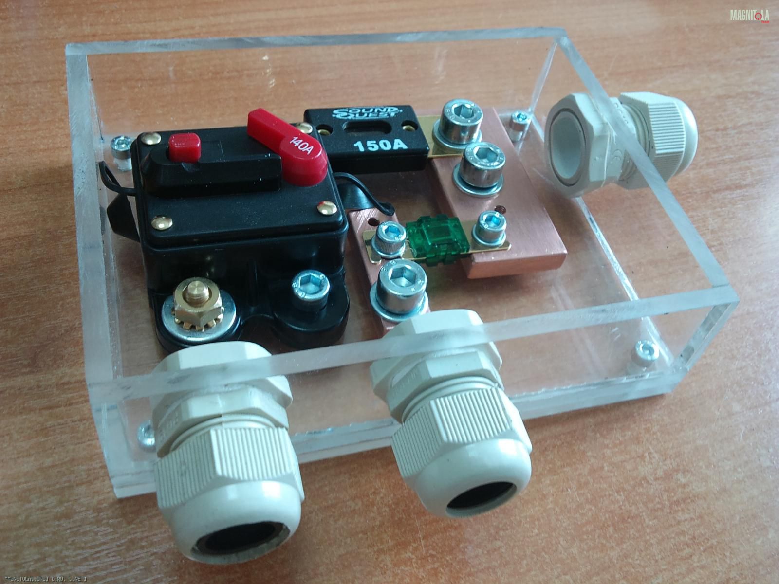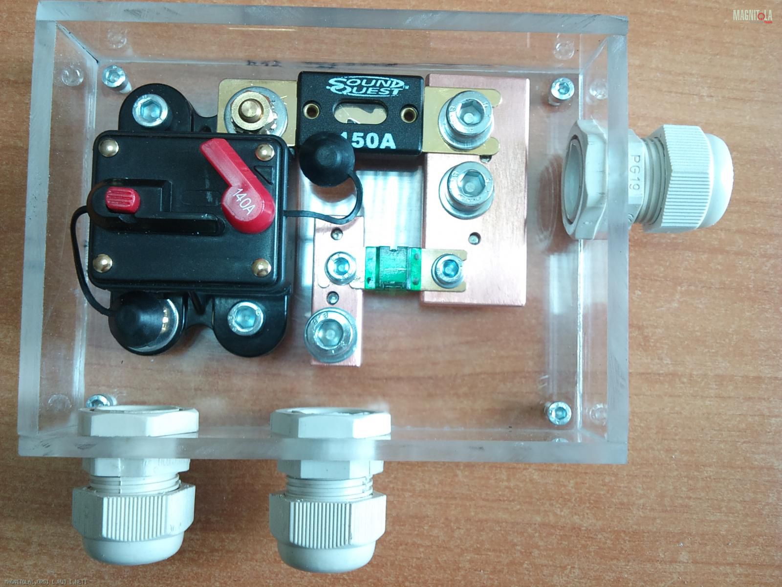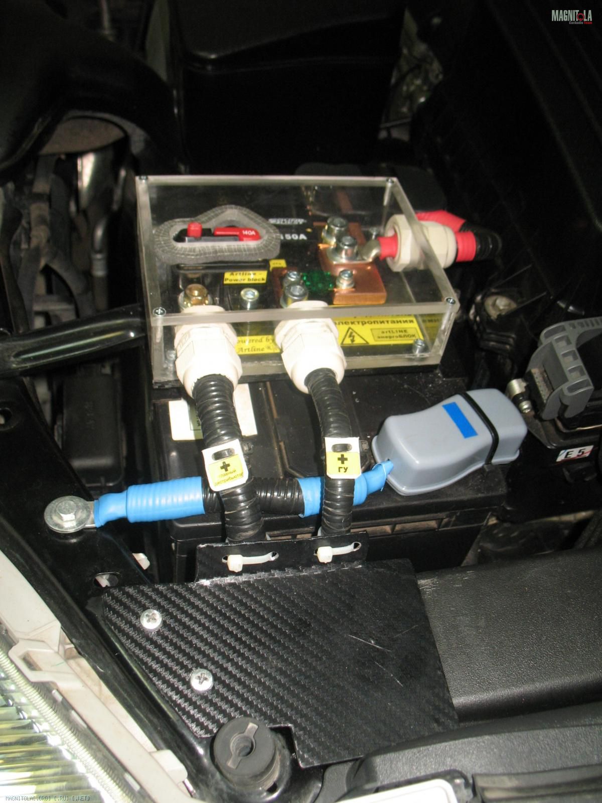 Эксплуатация системы выявила недостаток - токи утечки - и если машина долго стояла в гараже - АКБ по-тихоньку разряжался. Поэтому было принято решение установить автомат - и отключать каждый раз уходя. Автомат был выбран собственно из того что было - Мистери. И знакомство стало очень долгим как будет видно потом. Техника которую многие ругают - отработала на ура 5 лет. Может токовая защита в нем и не самая надежная, но всеже как расцепитель устройство стойко работало и было сделано очень много откл/включений без проблем! Подробнее тут - http://magnitola.org/pitanie-i-kommu...d-kapotom.html