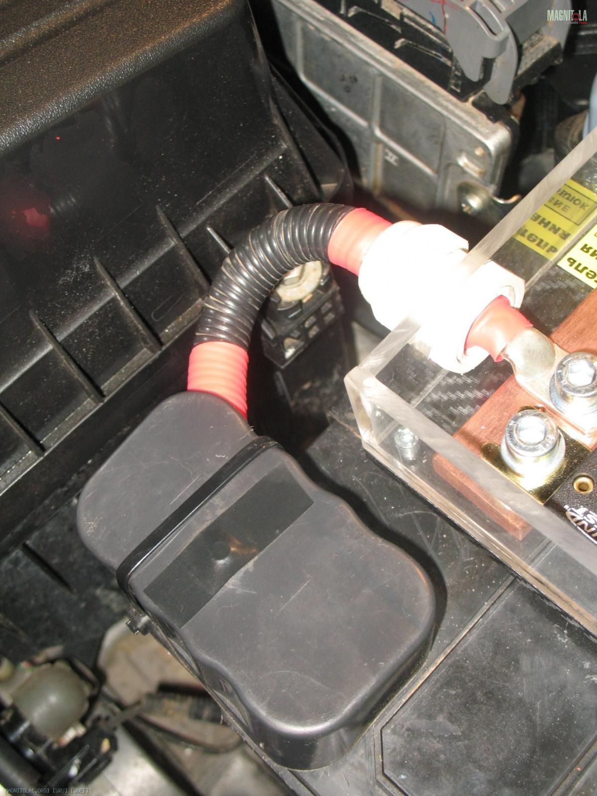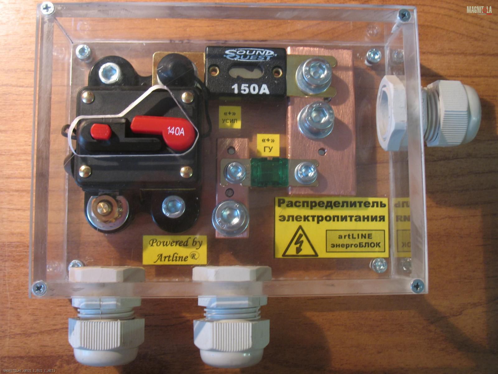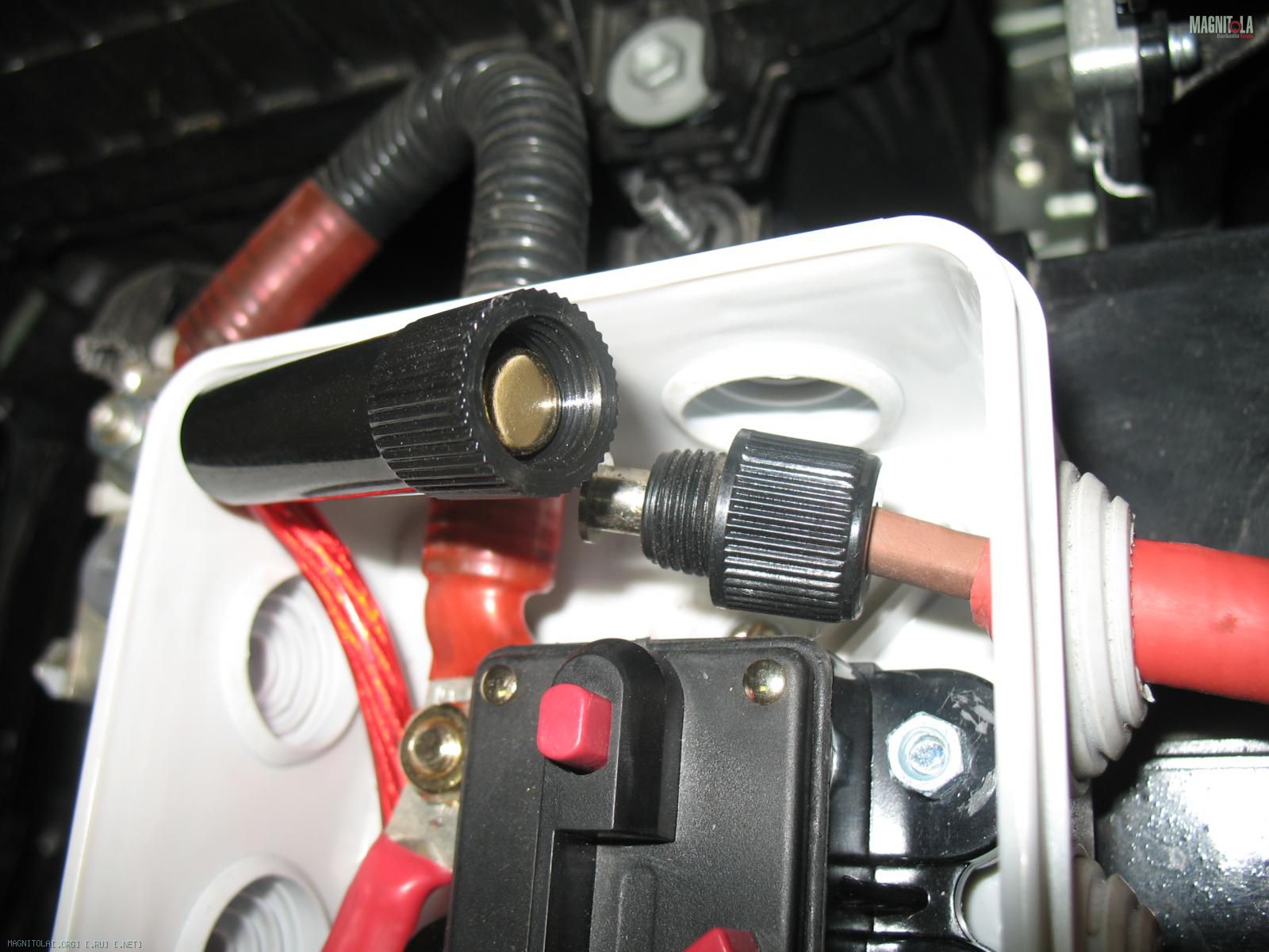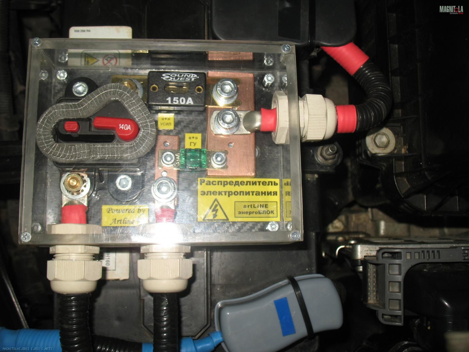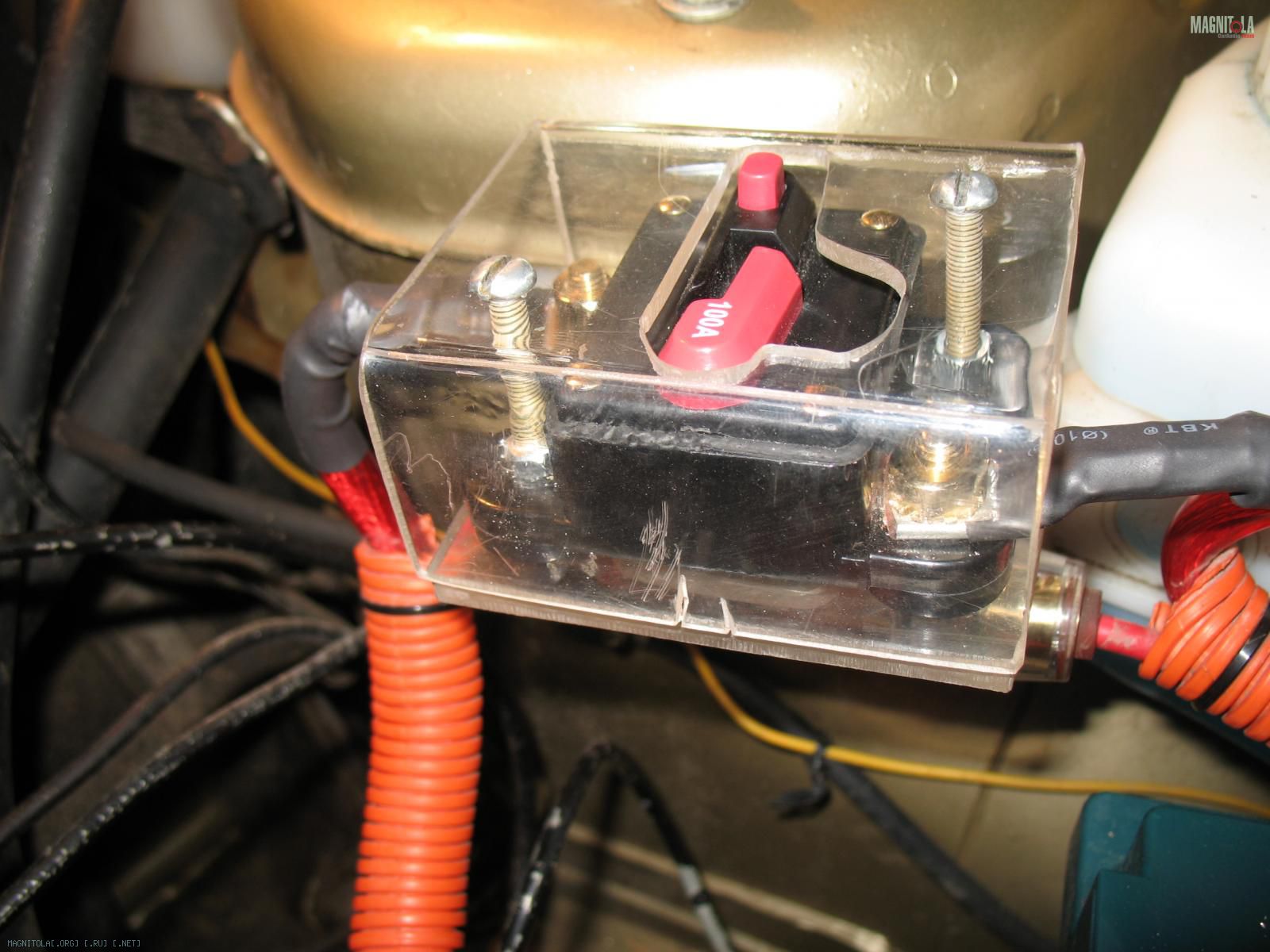Эксплуатация системы выявила недостаток - токи утечки - и если машина долго стояла в гараже - АКБ по-тихоньку разряжался. Поэтому было принято решение установить автомат - и отключать каждый раз уходя. Автомат был выбран собственно из того что было - Мистери. И знакомство стало очень долгим как будет видно потом. Техника которую многие ругают - отработала на ура 5 лет. Может токовая защита в нем и не самая надежная, но всеже как расцепитель устройство стойко работало и было сделано очень много откл/включений без проблем! Подробнее тут - http://magnitola.org/pitanie-i-kommu...d-kapotom.html