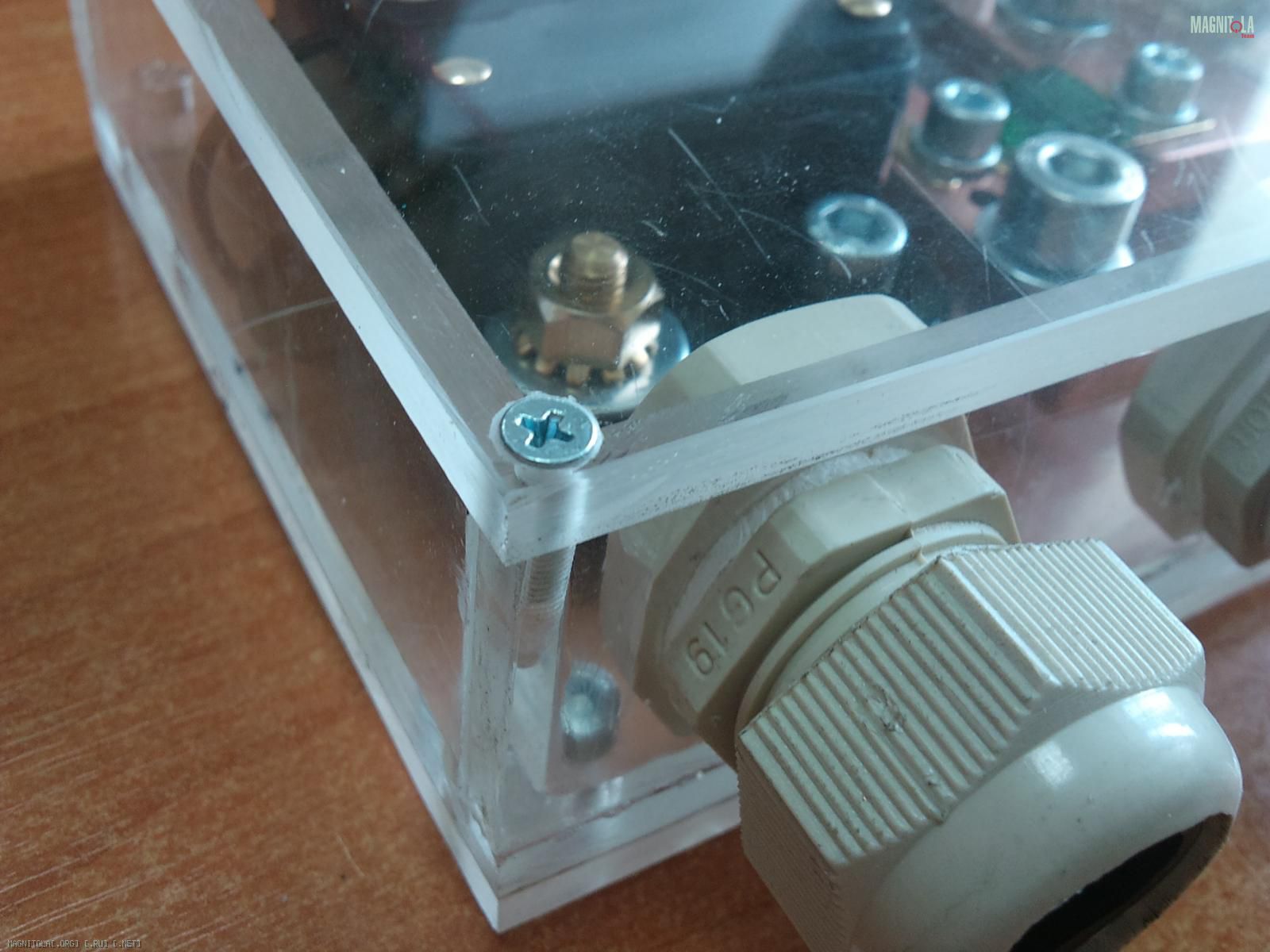 Что из этого вышло видно ниже. К вопросу подошел со всем старанием творчески. Корпус целенаправлено был выполнен из оргстекла 5 мм - для красоты и визуального контроля предохранителей. Распределитель отлично вписался на место бывшего демонтированного БСП-1. Кнопка управления автоматом-расцепителем выведена на поверхность и изолирована по периметру от попадания пыли внутрь устройства. Корпус устройства полностью герметичен и брызгозащищен - кабельные ввода очень прочно через сальники затянуты, крышка вплотную и окно для кнопок автомата также уплотнено.