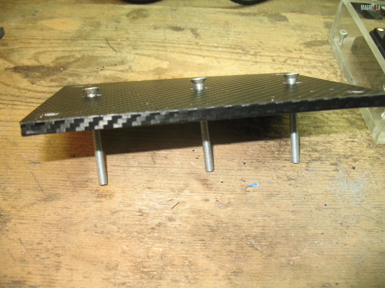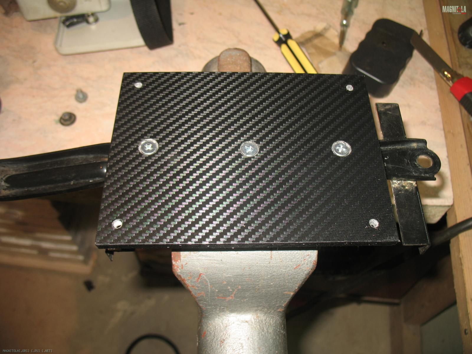 Площадка из того же оргстекла - обтянута пленкой под карбон. Крепление к планке акб на 3 М5. Фото добавил!