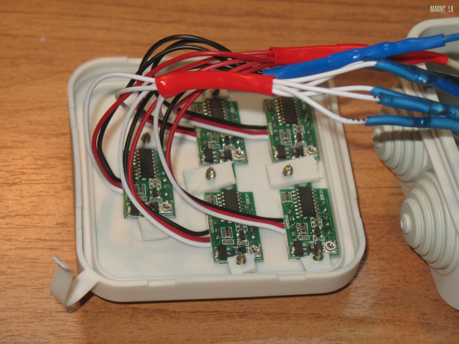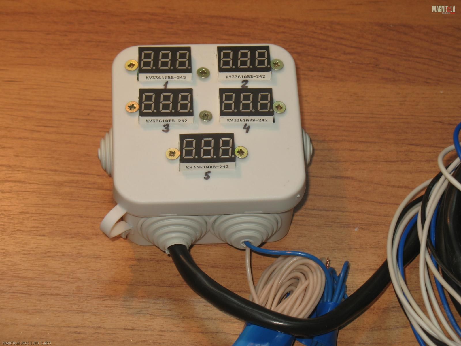 Блок контроля напряжения на 5-ти усилителях на вольтметрах компатного исполнения. Устройство имеет управляющий вход на включение. Включаеться при включении ГУ и показывает напряжение на силовых входах 5-ти потребителей (усилителей). Размеры бокса всего 70х70х45 мм.