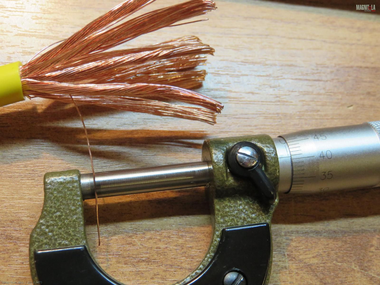 2. Далее прибором микрометром (с точностью минимум 0,01 мм) - измеряем диаметр одного медного проводничка из которых стотоит весь наш провод.