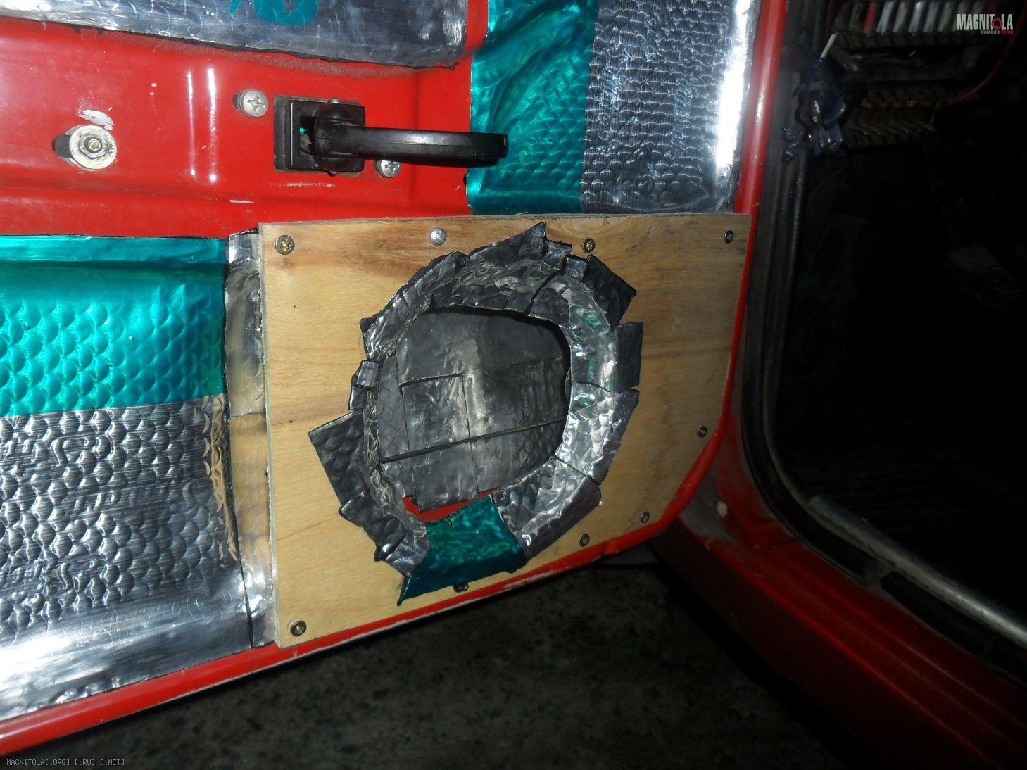 Сделал вибру двери, закатал ей технологические отверстия в 2106... фанеру 6мм с кругом под дин прикрепил к нижнему правому краю двери на саморезы, убрал лишние щели... Через проставку 16+16мм поставил дин... Включил и разочаровался.. Баса стало меньше! Кручу баланс на правый динамик который держится на проставке, закрученной саморезами к !обшивке!, которая неплотно прижата... И там звук куда лучше! Виброизоляции там нет...
