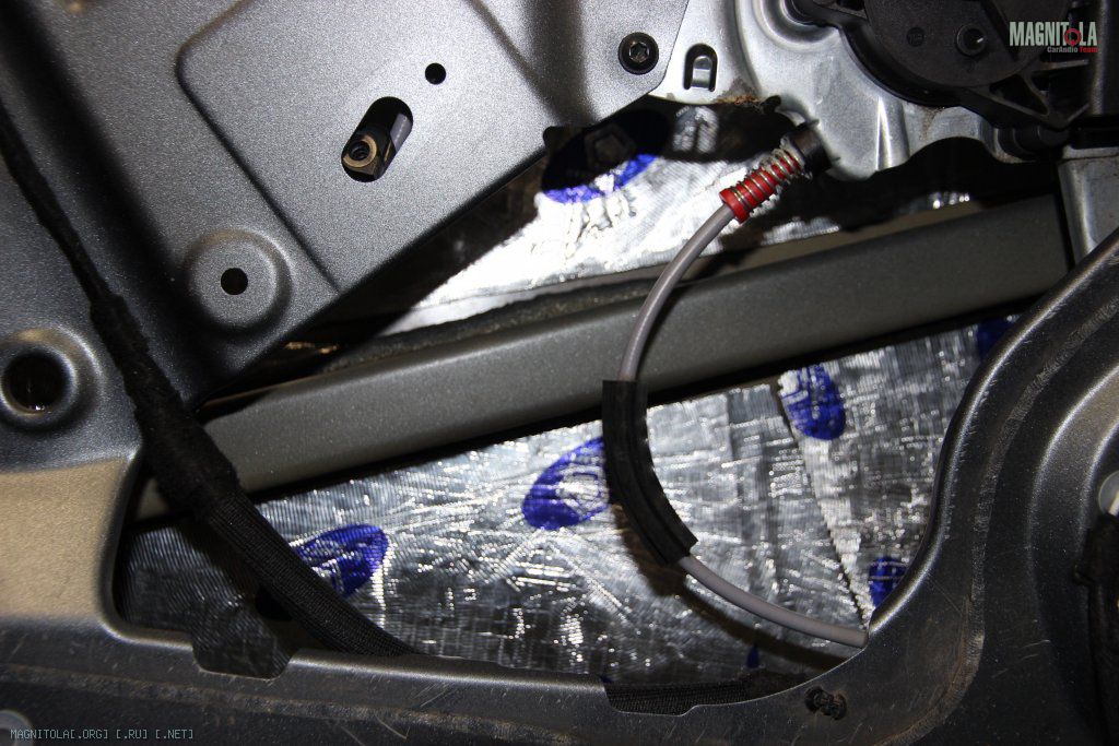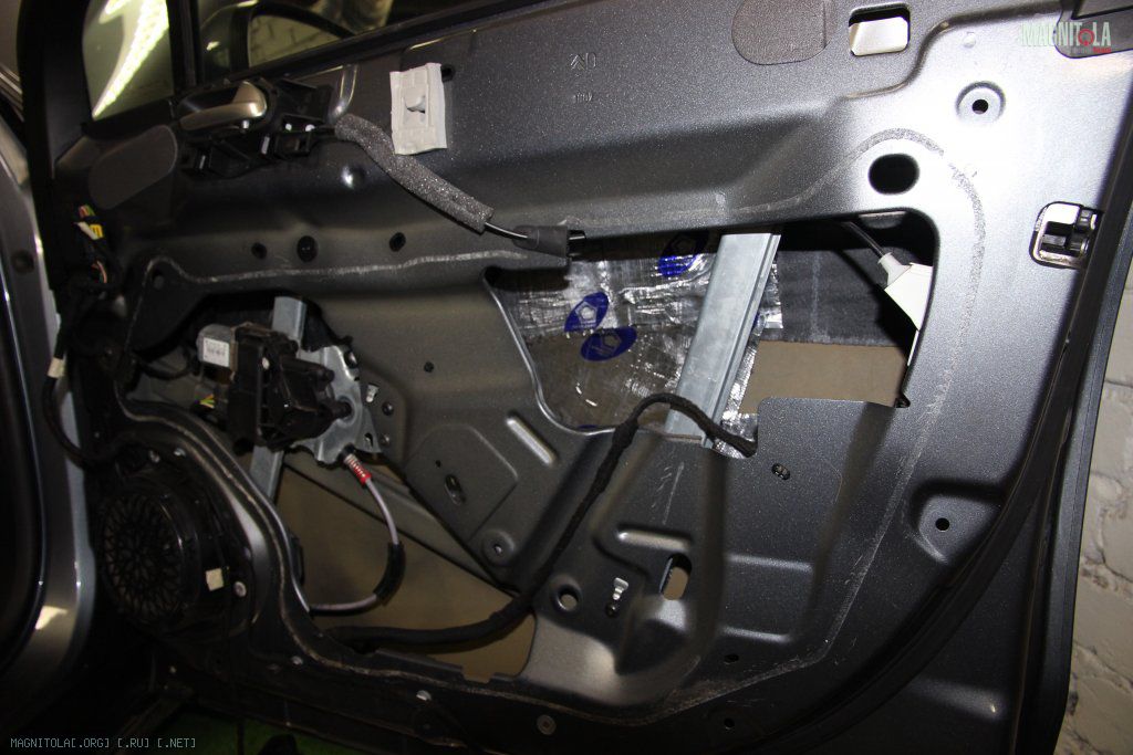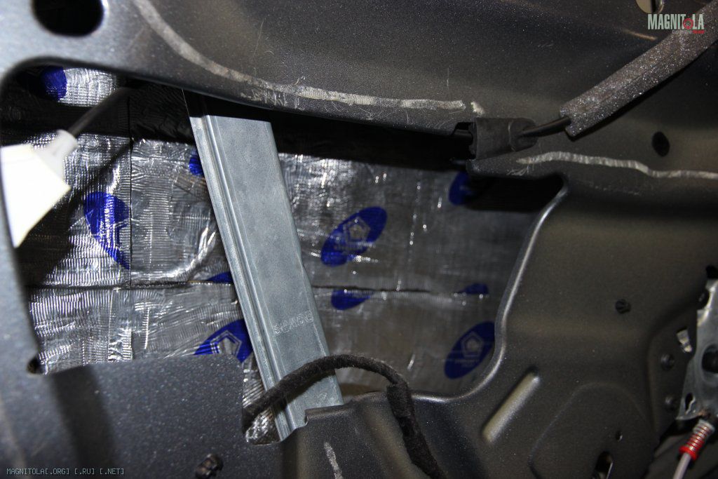 Есть и такой вариант: клеить вибру с нахлестом, т. е. образуется дополнительное ребро жесткости в месте нахлеста. Обязательно связать виброй силовые элементы в двери с жестью двери для большей жесткости.