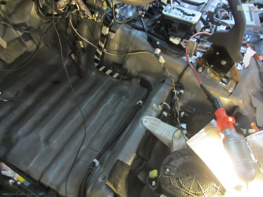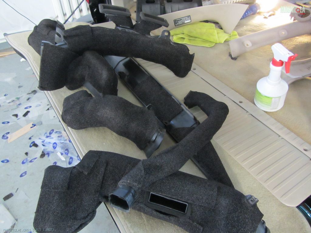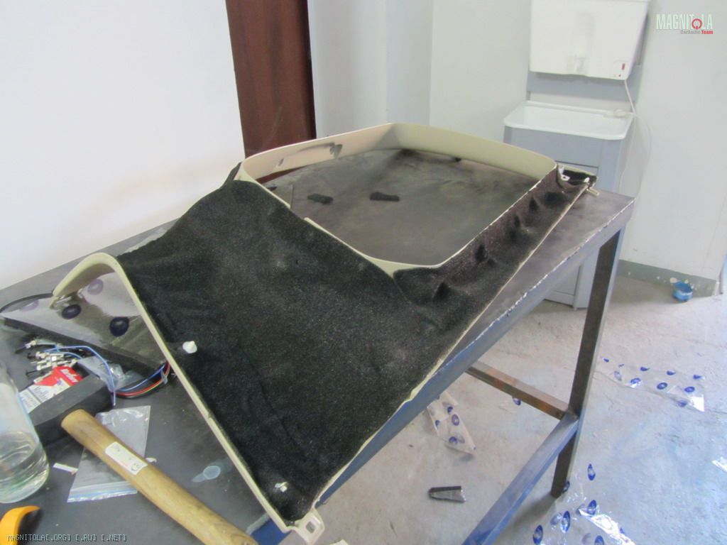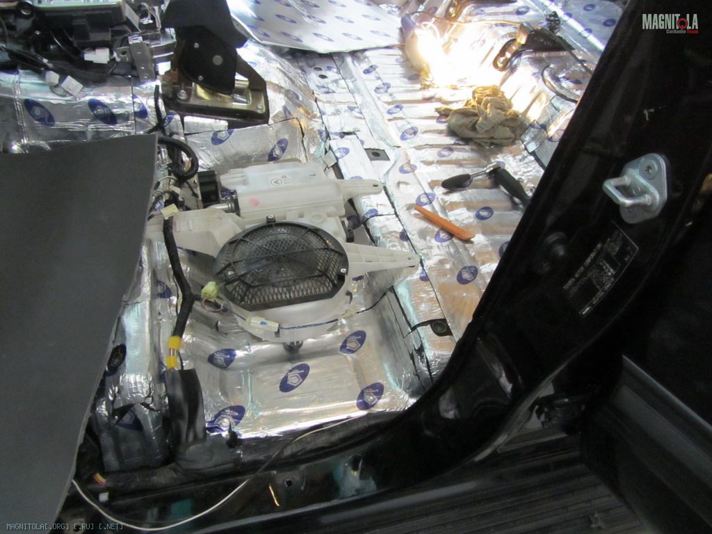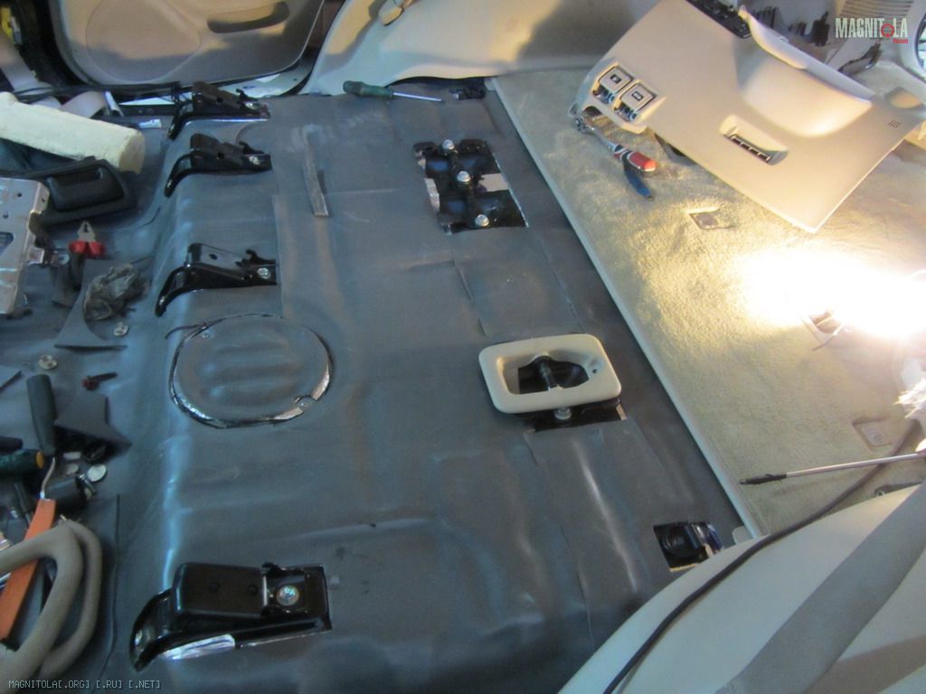 Так как в дверях находятся динамики, для подавления отражения звуковых волн мы проклеили за динамиками небольшую площадку материалом Изоскрип. Конечно, в иделе был бы материал Изофлекс Акустик, но, к сожалению, такового не было в наличии и мы использовали то что было из наиболее подходящего.