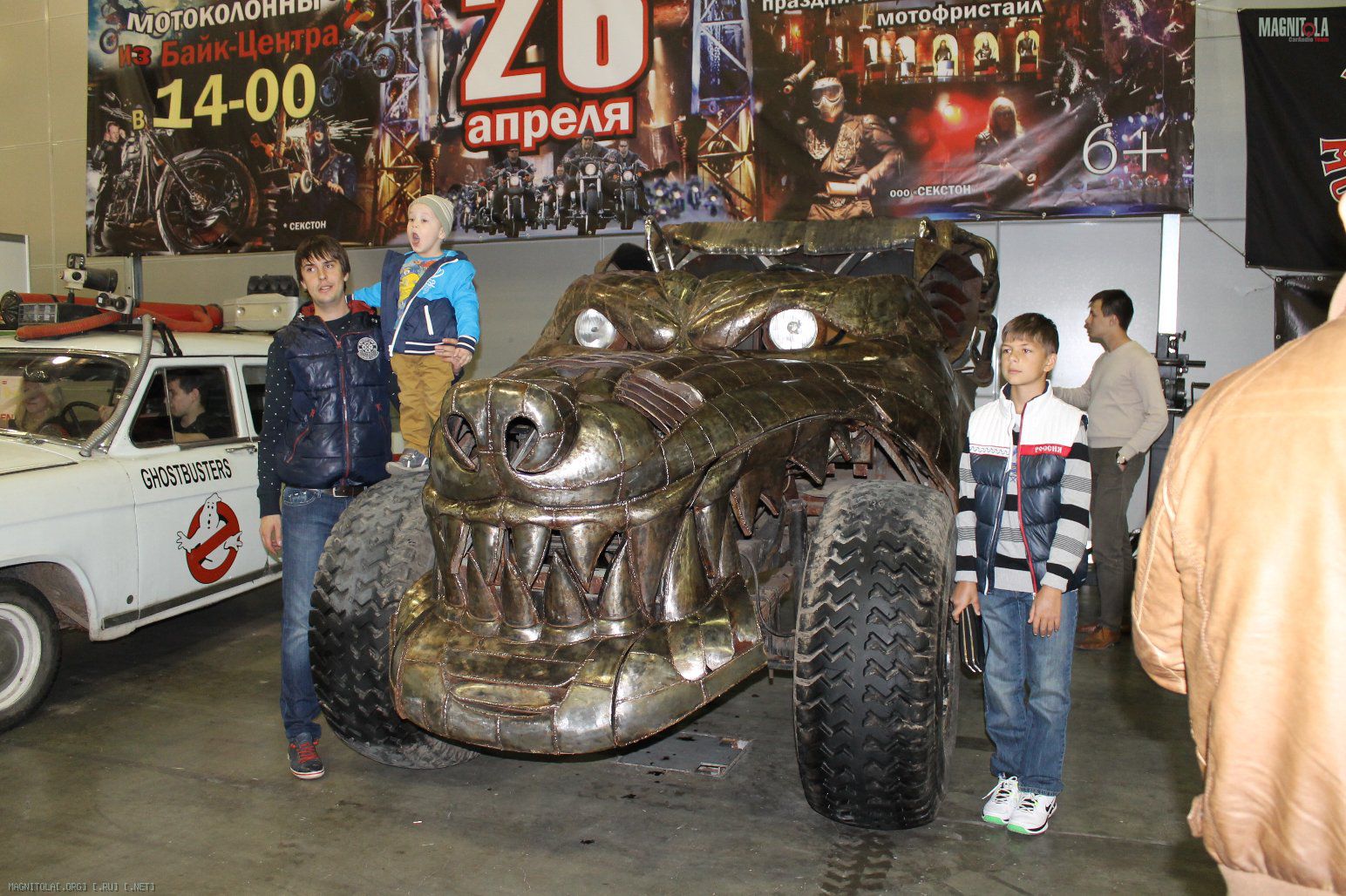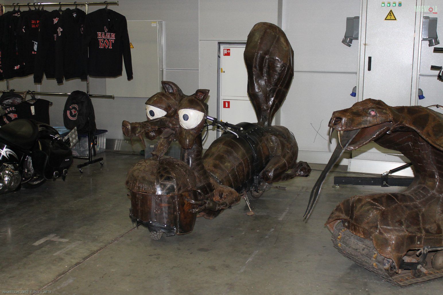 Байкерский уголок. Мопед в виде белки и еще что-то в виде головы собаки: