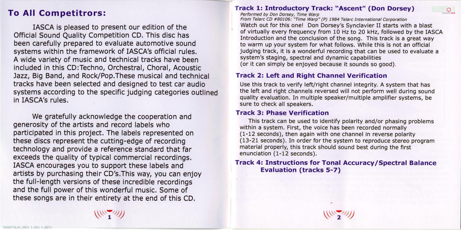 Detailed sound stage maps in the liner notes of the Official IASCA Competition CD provide the exact locations of specificinstruments and voices in the recordings used to evaluate this category. These maps have been produced in conjunctionwith the recording engineers who produced the tracks.