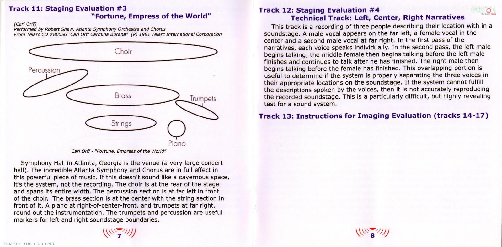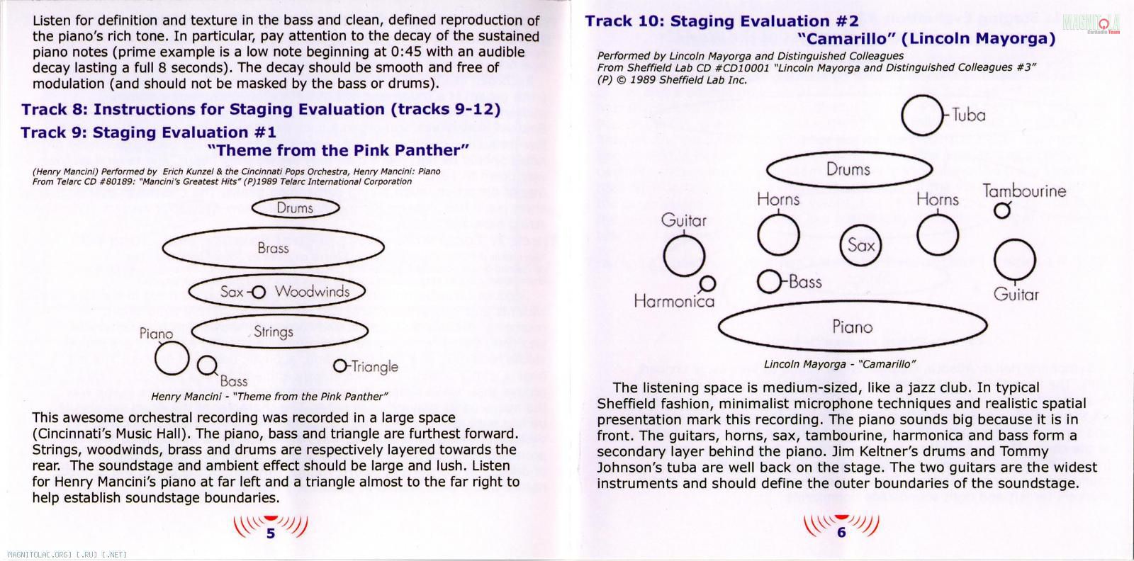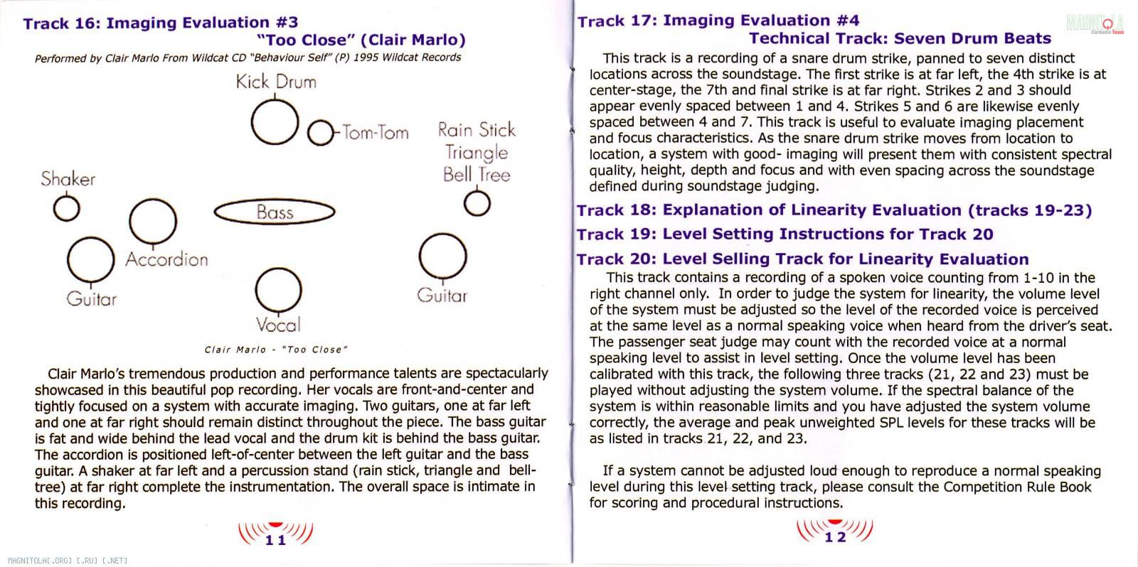 "Системы оцениваются на основе их способности точно воспроизвести расположение и размеры звуковых образов на звуковой сцене.Детальные звуковые карты есть на вкладке компакт диска RASCA и отражают точное расположение и размеры определенных инструментов и вокала для сравнения во время судейства. Эти карты были составлены вместе с инженерами, которые записали треки.Если образ будет казаться противоестественно вытянутым по горизонтали или вертикали, блуждать при изменении подачи или “раскалываться” на два или более образов, то баллы снижаются."