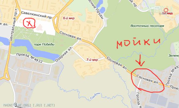 2. Мойки - сконцентрированы вдоль Сосновой ал. в р-не домов 2с1 - 6с1 - это промзона.