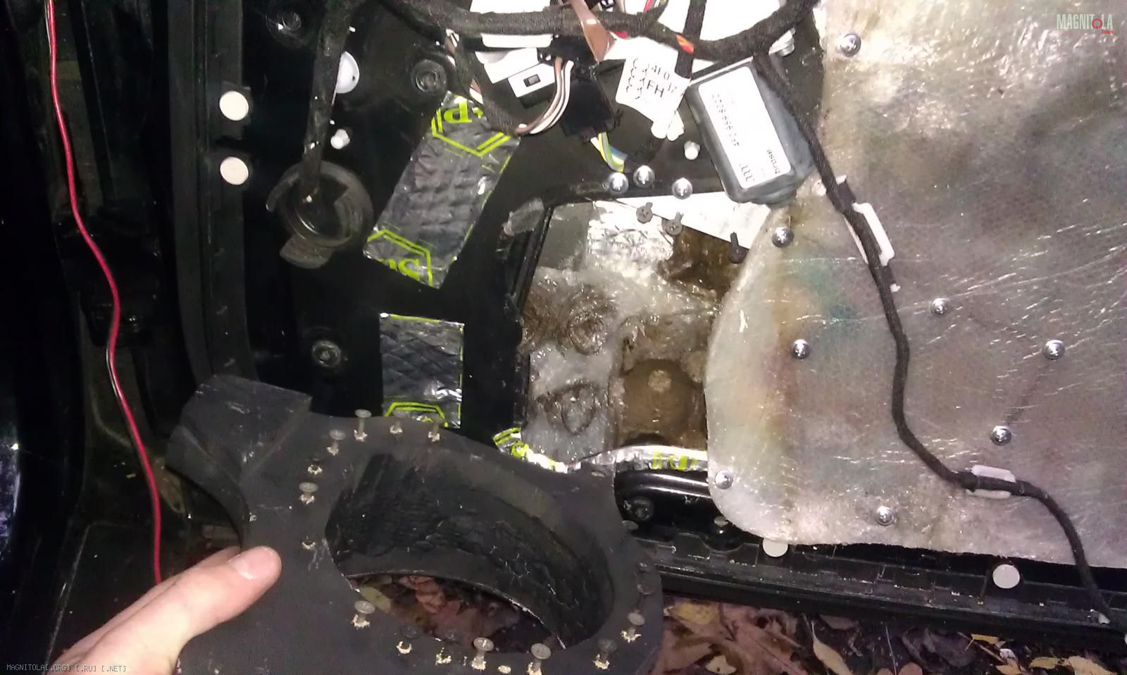Поставил подиумы! Достаточно ли будет такого отверстия для полноценной работы динамика? Дело в том, что у меня как раз здесь стоит направляющий профиль стекла (на фото немного видна верхняя левая часть). Стоит ли сверлить отверстия справа от него?